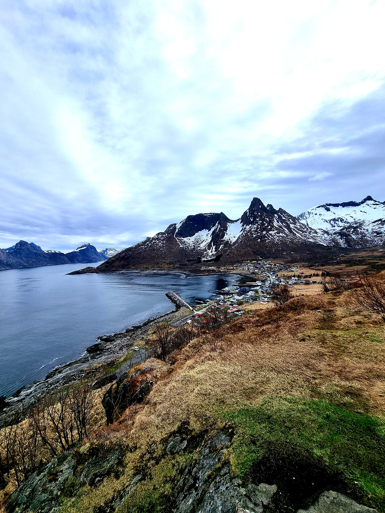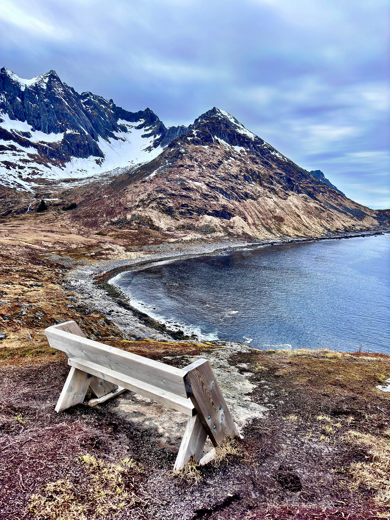 이 아름다운 바다와 마을을 보기 위해 또다시 산에 올랐다. Knuten이라는 피오르를 올라볼 수 있는 전망포인트가 있다고 해서 갔다. 마치 동네 뒷산인 것처럼 길도 있고 어렵지 않게 올라갈 수 있다는 설명을 봤지만 우리는 꽤 고전하면서 올라갔다. 높은 산은 아니었으나 산세가 가팔랐다. 그리고 위에 올라가니 이 전망을 바라보라는 나무 벤치 하나가 바다를 향해 놓여 있었다. 산 위에서 끝없이 펼쳐지는 바다를 바라볼 수 있었다.