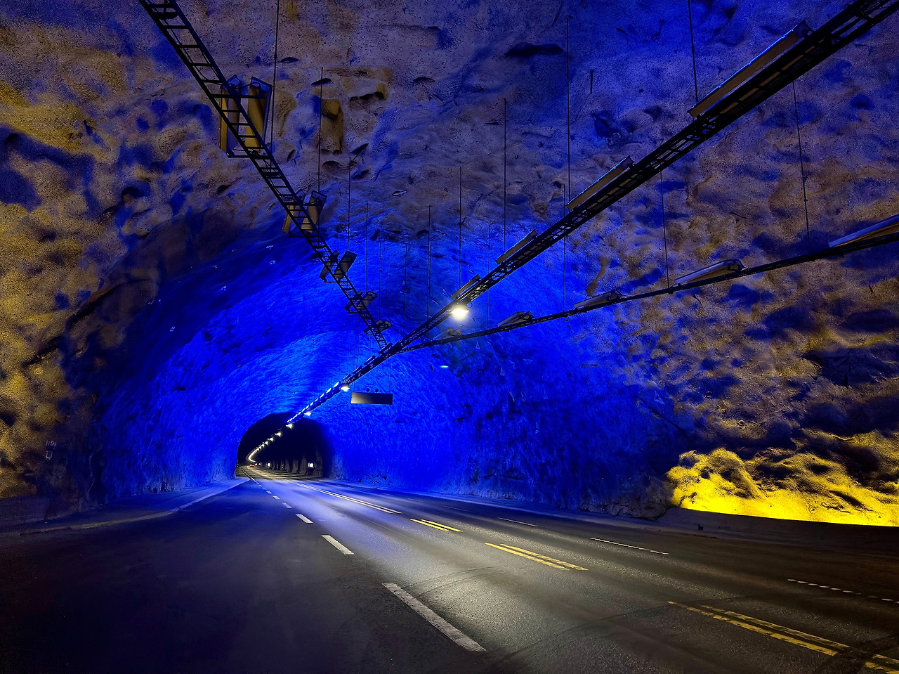 멋진 풍경대신 세계에서 가장 길다는 레르달터널 Lærdal Tunnel을 지나간다. 티비엔 <텐트 밖은 유럽_노르웨이> 편에서 등장해서 우리에게도 익숙한 터널이었는데, 긴 길이와 중간중간 이벤트에 출연자들이 흥분한 모습이 기억이 난다. 레르달터널은 길이 24.51km의 긴 터널 주행으로 인한 정신적 부담을 고려한 설계와 최신 안전시설로 유명하다. 4개 구간으로 나눠 6km마다 대형 동굴이 설치되어 휴식공간을 제공하는데, 북쪽 지역 일출을 연상시키는 청색과 황색 조명 사용해 독특한 장관을 연출한다. 또한 세계 최초로 터널에 공기정화시설 설치했다는데, 이토록 긴 터널이라면 가장 필요한 요소였을지도. 노르웨이에서 워낙 긴 터널들을 지나면서 익숙해진 탓에 그 길이가 대단하게 다가오진 않았지만, 흥미로운 조명쇼와 공기가 탁하지 않다고 상쾌하게 느껴지는 게 신기하기도 했다.