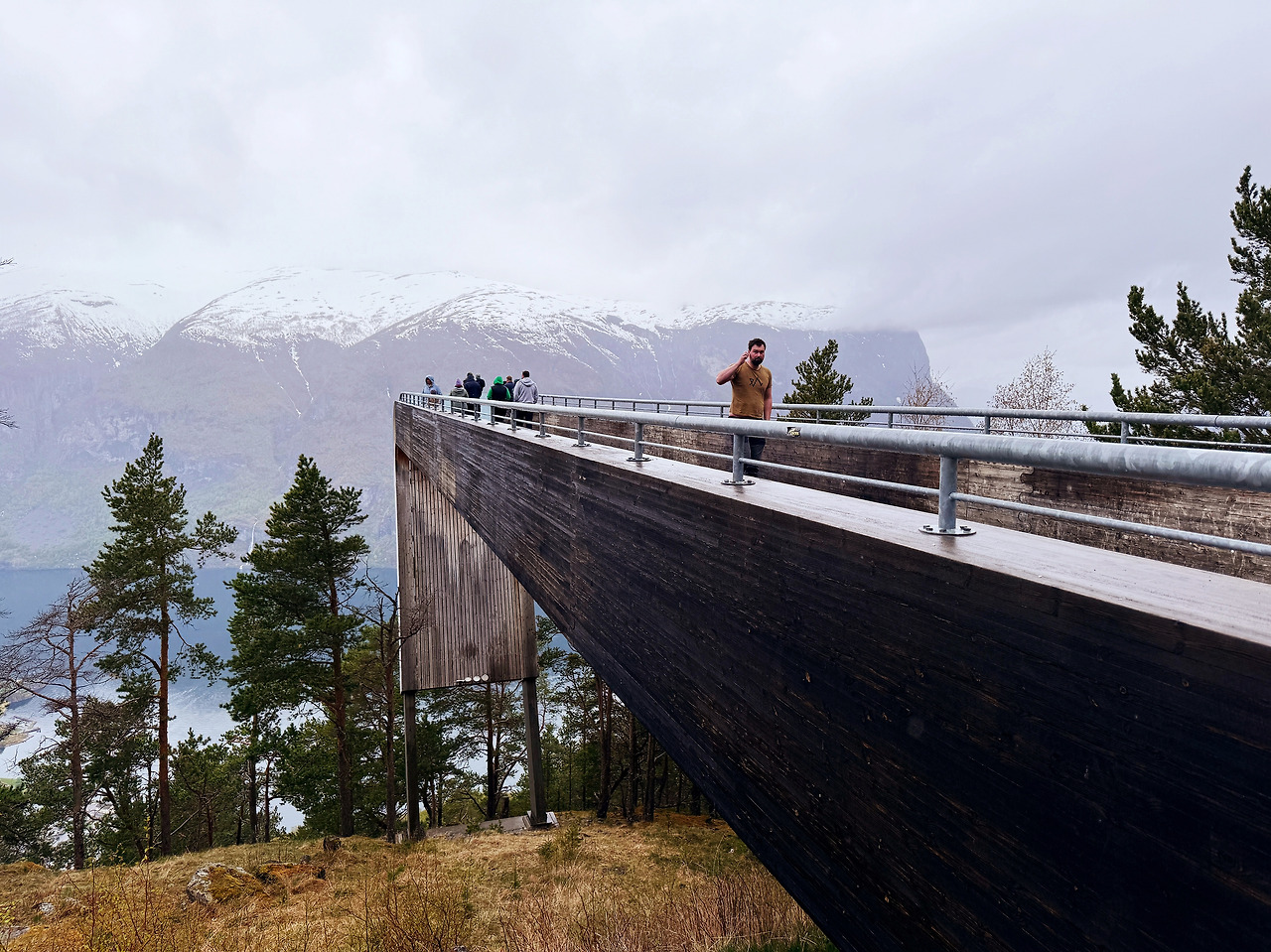 기대하던 스테가스테인 전망대가 안개에 싸여있어 전망이 잘 보일는지 걱정이 앞섰다. 지그재그 좁은 길을 아슬아슬 올라간 전망대는 소나무 사이에 피오르를 향해 세워져 있었다. 오를란스피오르 Aurlandsfjord 위 650m에 아찔하게 서있는데, 전망대의 끝에는 전면이 유리로 되어 있어 시원한 피오르의 전망을 보여준다.
