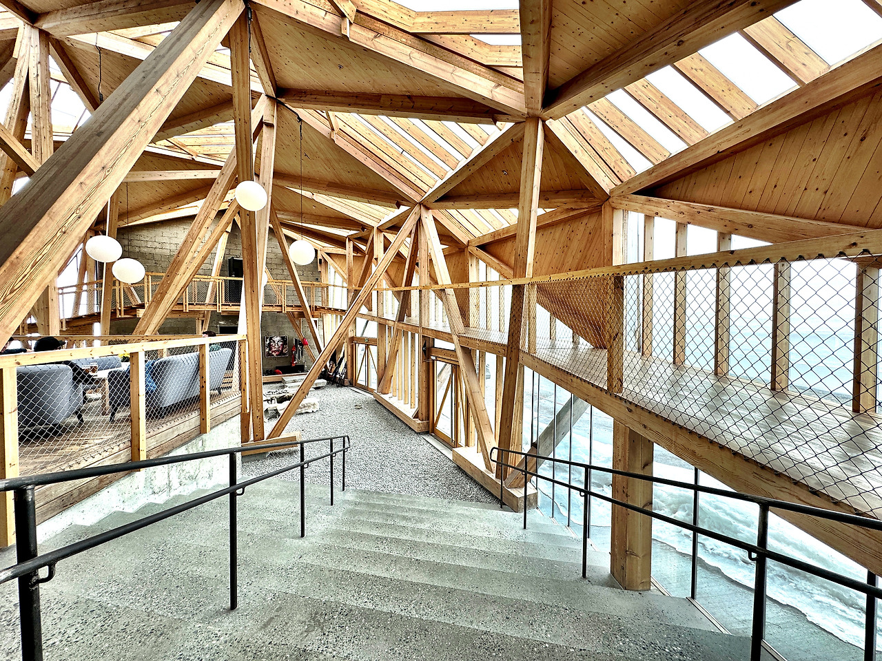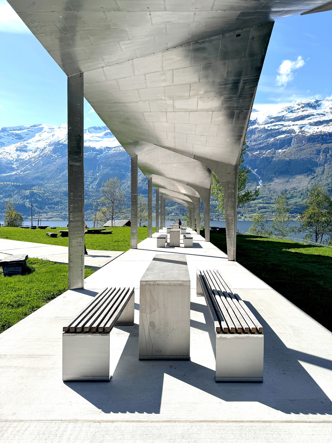 휴게소는 높이가 다른 12개의 지붕 모듈이 철제 구조물로, 지붕 아래에는 전망을 즐기고 휴식을 취할 수 있는 화장실과 벤치가 있는데, 그 뒤로 피오르드를 따라 북쪽으로 펼쳐지는 멋진 전망을 감상할 수 있다.