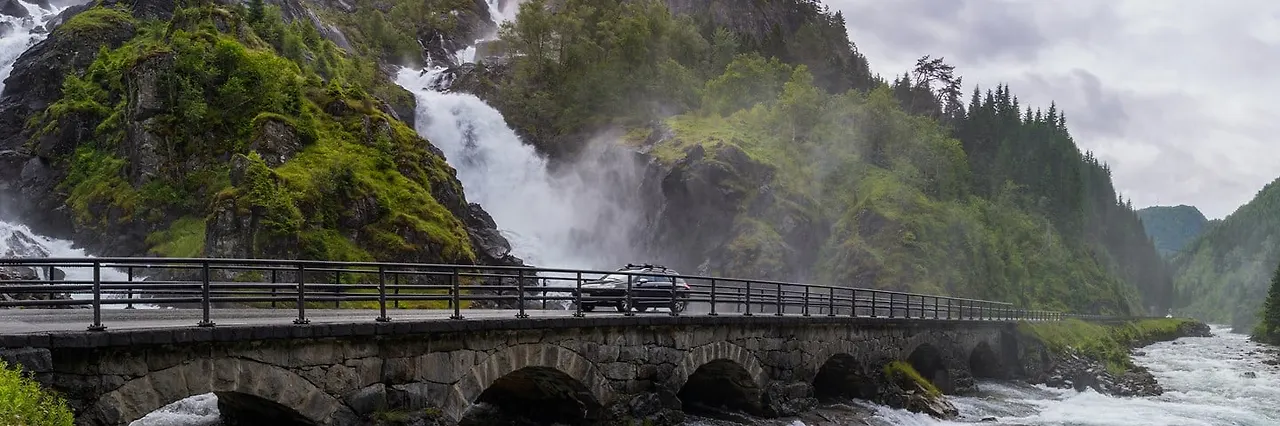 플롬으로 이동하는 경로에 있는 Hardanger 하르당에르는 Steinsdalsfossen, Vøringsfossen, Skjervsfossen, Låtefossen, Furebergfossen의 큰 폭포로 둘러싸여 있는 루트로 멋진 폭포를 좋아하는 사람에게 추천할만하다. 우리가 포기했던 트롤퉁가 하이킹과 빙하를 볼 수 있는 부아르브린 하이킹도 포함되어 있다. 보링포센 폭포 Vøringsfossen를 보고 싶었지만, 이동하는 시간을 고려해서 라데포센 폭포 Låtefossen를 지나가기로 했다. 좁은 계곡을 지나는 도로 뒤편으로 쌍둥이 폭포 Låtefossen 가 산비탈을 따라 쏟아져 내리고, 물보라는 도로를 적시며, 아치형 다리아래 강으로 흘러가고 있었다.
