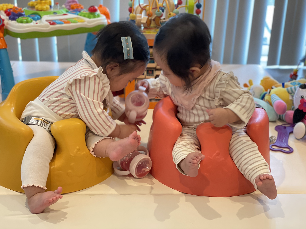 아기를 키우면서 이모님이 안 계시는 주말을 어떻게 버텨야 하나 걱정하던 우울한 금요일에서 점점 마음이 편해짐을 느낀다. 가장 큰 이유는 아마 아이들이 둘이 놀기 시작하면서부터인 것 같다. 완전히 둘만 놓고 다른 일을 보진 못하지만, 잠깐씩 아이 둘을 범보 의자나 매트에 앉혀놓고 장난감 몇몇을 놓아주면 둘이 잘 논다. 장난감을 이것저것 만져보기도 하고 서로 옹알이로 뭐라 뭐라 하기도 하면서 엄마를 찾지 않는 시간이 온다. 9개월의 기적이라고 해야 하나.