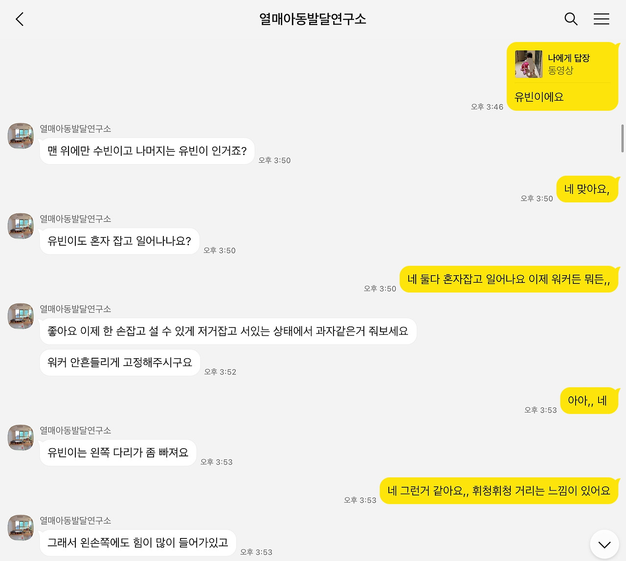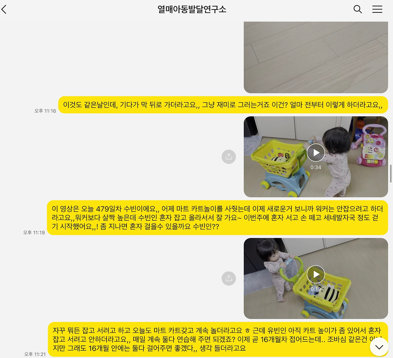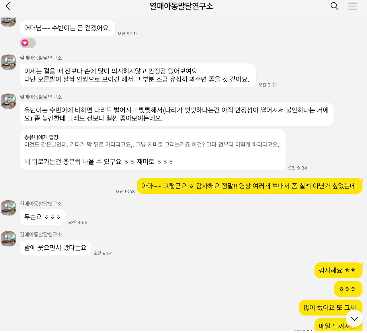 수업을 마치고 나서도 나는 아이들 영상을 보내면 발달 상태를 체크해 주시겠다던 선생님 말을 잊지 않고 2주에 한 번은 영상을 보냈던 것 같다. 아이들이 완전히 잠든 밤 11시 정도가 되어야 영상을 정리해 첫째, 둘째 나눠서 보낼 수 있었는데, 아침이면 늘 꼼꼼한 조언과 아이들 예쁘고 기특하다는 선생님 칭찬이 감사해서 나도 꾸준히 기록했던 것 같다. 혼자 했으면 더 숙제 같았을 일들이 어른 여럿이 다 도와주시니까 해낼 수 있는 팀플 과제처럼 느껴졌다. 친정 엄마는 두 발을 지면에 닿길 거부하고 살짝 높은 곳에 앉으면 내려오길 무서워하는 둘째를 위해 매일같이 저상 침대에서 내려오는 연습을 시켜주셨고, 친정 아빠는 퇴근 후 매일 첫째가 할아버지만 따라갈 정도로 두 손 잡고 걸음마 연습을 해주는 사람으로 인식되고 있었다.