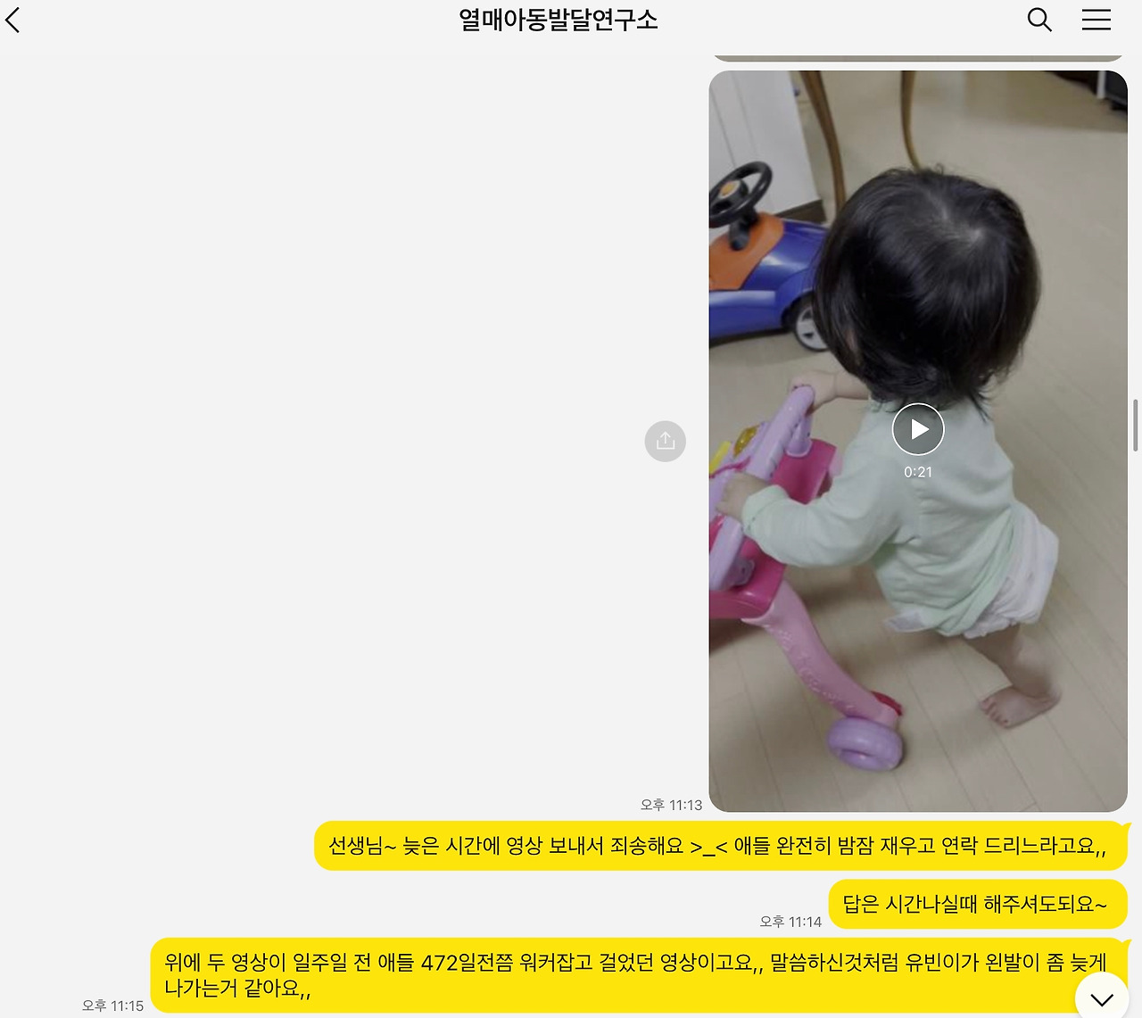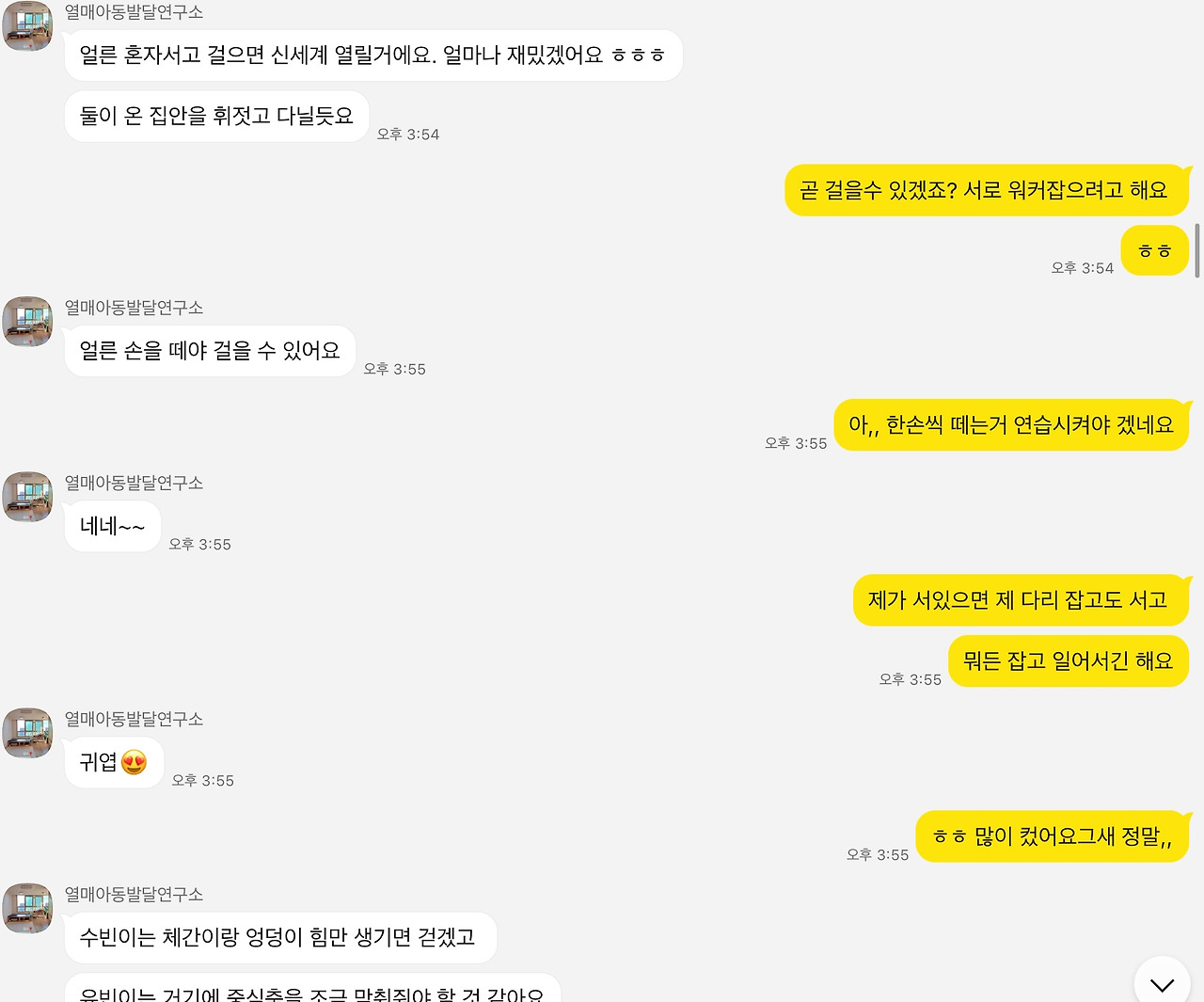 사실 아이들 100일 때부터 같이 봐주신 이모님께서도 다른 애들에 비해 유난히 터미 타임을 싫어하는 편이라고 하시기는 했었다. 지금 시기엔 분명 소파를 잡고 서려고 할 텐데 두 아이는 그럴 생각이 없어 보인다고 하시기도 했다. 완전히 흘려들은 건 아니었지만 매번 ‘때가 되면 다 하겠지’ 하는 생각을 하며 넘겼다. 행동 발달이 인지 발달로 연결된다는 친구의 얘기를 들은 순간부터 마음이 좀 복잡해진 기분이었다. 친구가 친정엄마 집 근처의 ‘열매아동발달센터’라는 곳을 소개해주자 이 일이 더 무겁게 다가왔다. 시의 적절하게 네발기기나 소파를 잡고 무릎 서기 등의 대근육 운동을 할 기회를 주지 않은 엄마인 내 책임인 것만 같았다.