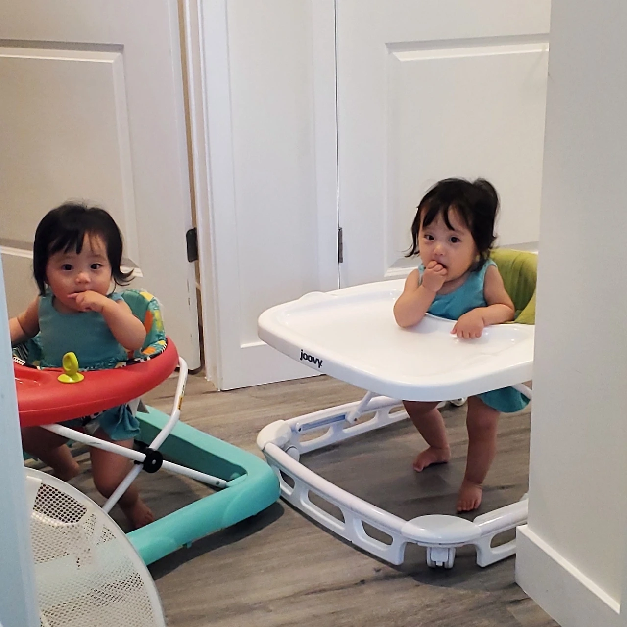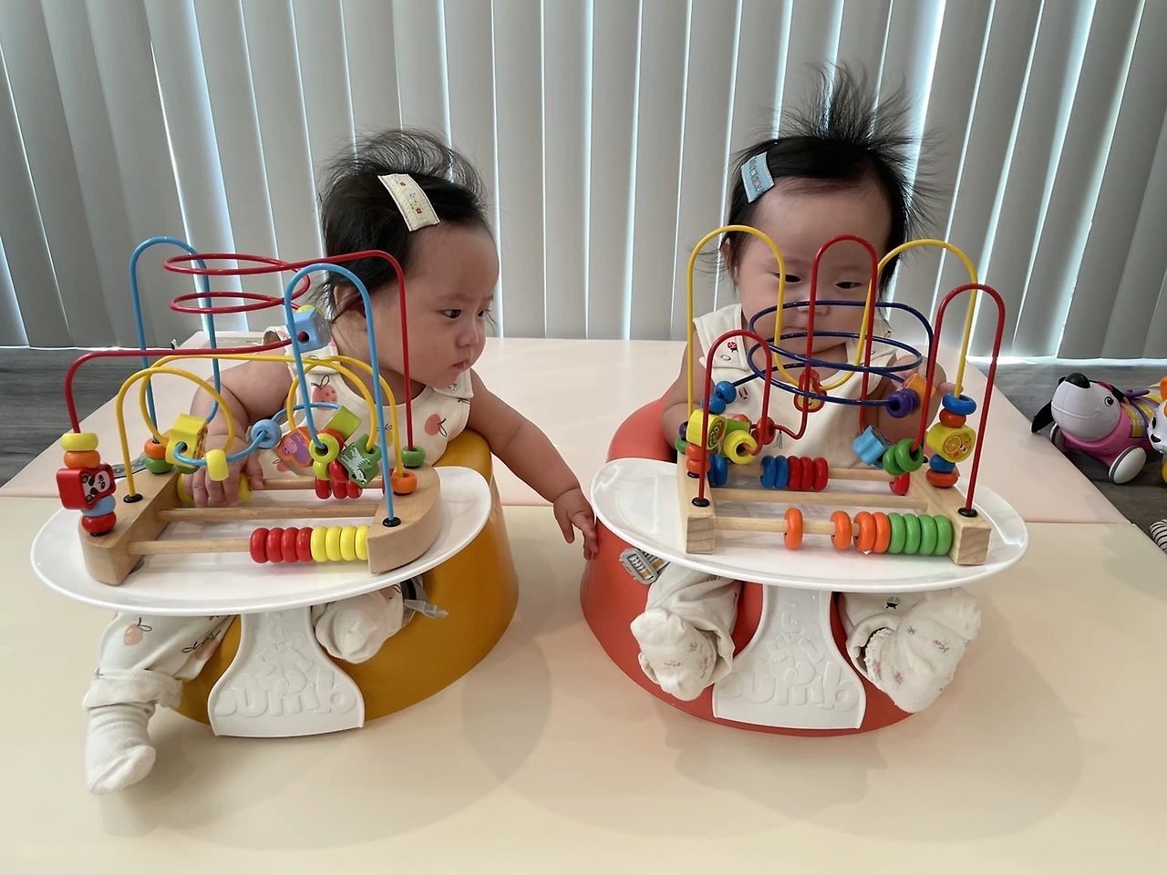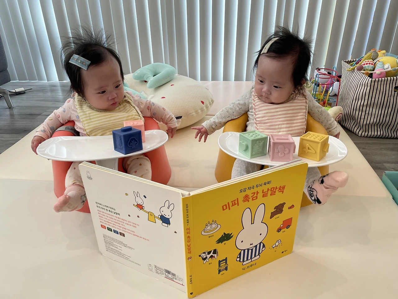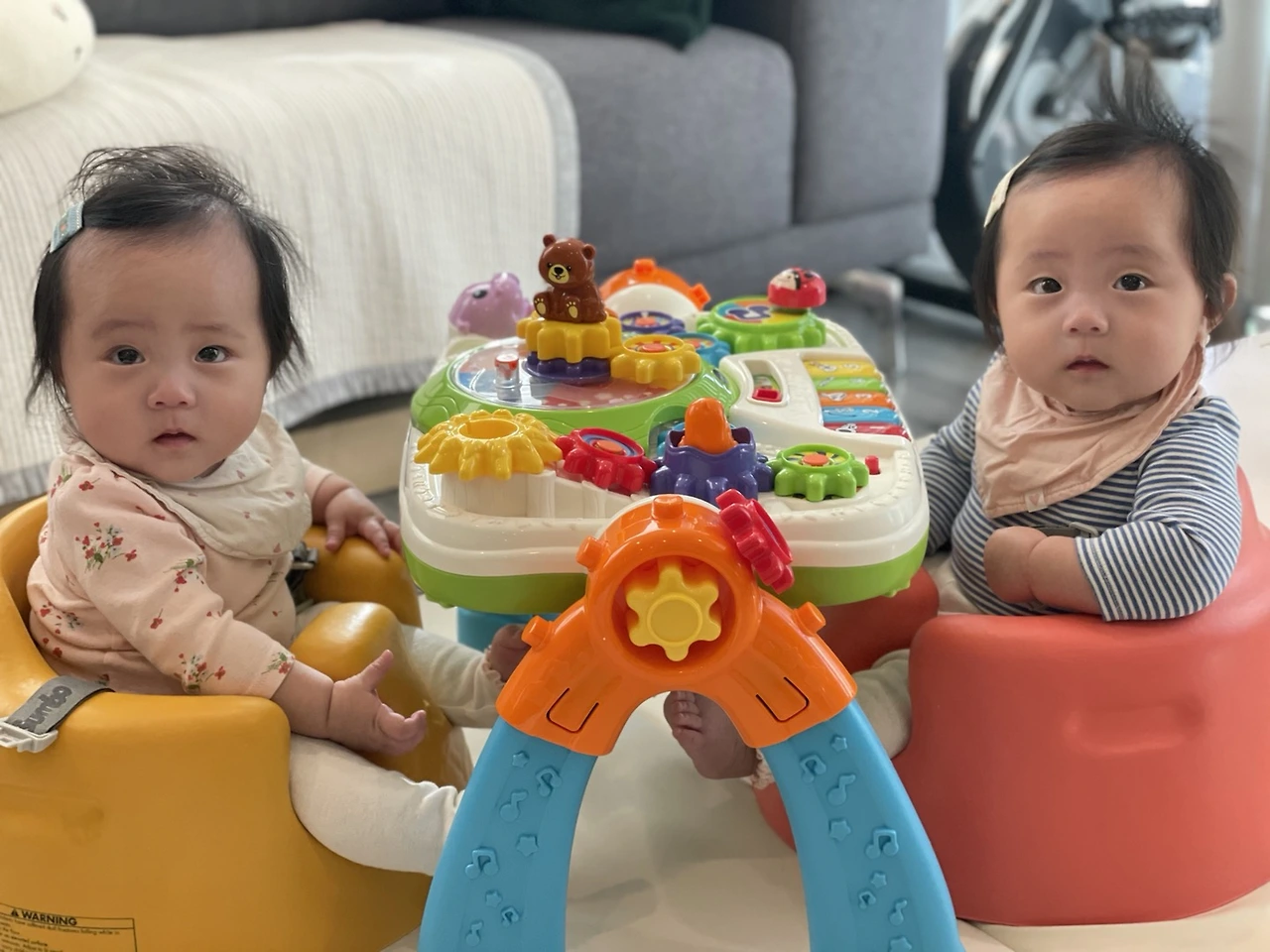 친구의 기기-걷기-말하기가 한 세트라는 말을 듣고 슬슬 걱정이 되기 시작한 것 같다. 쌍둥이지만 3.11, 2.76킬로의 정상 체중으로 태어난 아이들이고 돌 때까지 감기 한 번밖에 걸리지 않은 건강한 아이들이니까 다른 것도 다 문제없겠지 하는 생각이었다. 사실 두 명의 먹이고, 입히고, 재우고 하는 일만 해도 하루가 너무 바쁘게 돌아가던 일상이었다. 둘이 마주 보고 범보 의자에 앉혀놓고 둘이 만질 수 있는 커다란 장난감 하나 놓아두면 젖병 소독 정도는 할 수 있었다. 돌이 가까워졌을 때쯤 보행기 두 개를 태워놓으면 집안일할 시간을 벌었다.