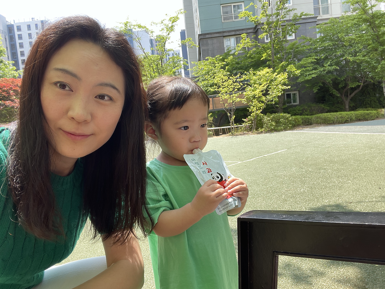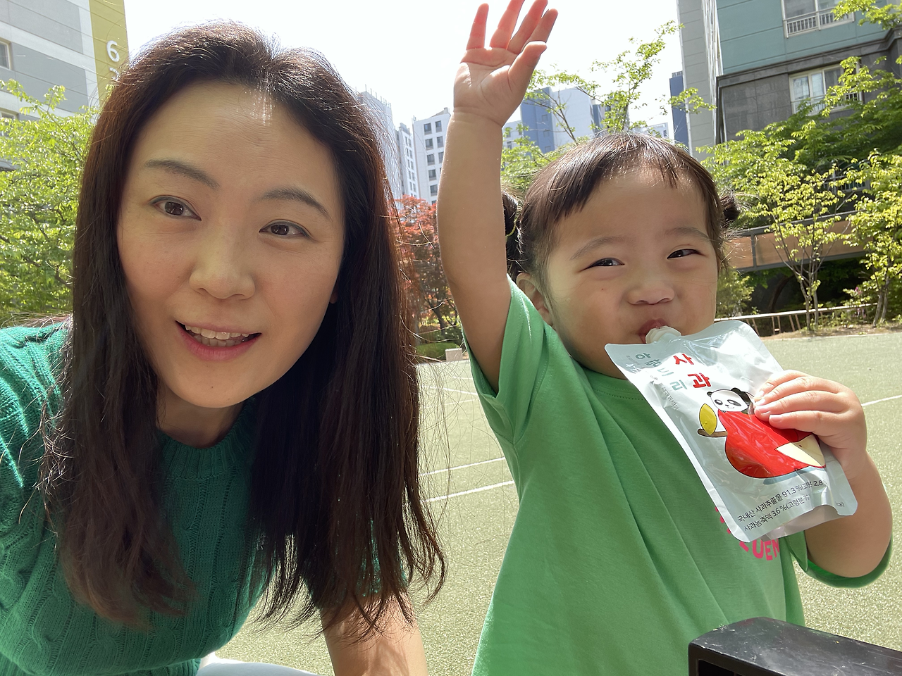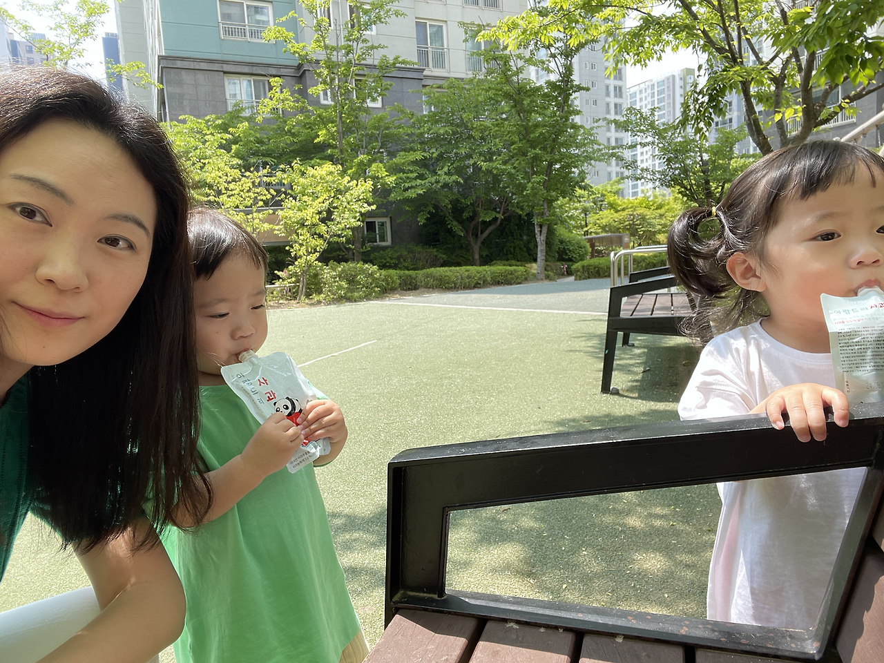 어쨌거나 병원 끝나고 놀이터에 갈 계획이었으니 순서가 바뀐 것으로 긍정적으로 생각하고 병원에서 가장 가까운 동네 놀이터로 향했다. 부랴부랴 나오느라 애들 간식을 제대로 안 가져 나와서 오아시스 마켓에 들러 사과주스 2, 샤인머스캣 주스 2, 새우짱 과자를 급히 샀다. 놀이터는 1/10 정도만 그늘이고 나머지는 다 땡볕이었다. 선크림을 바르긴 했으나 땡볕에서 아이 둘을 볼 자신이 없어 챙겨 나온 비눗방울 총을 너무 빨리 꺼냈다. 내가 비눗방울을 쏘면서 술래잡기 놀이도 하려고 했으나 호기심 많은 첫째에게 바로 뺏겨 버렸다. 첫째는 어제 터득한 방아쇠 버튼 고정을 요청했고, 나는 소리 지르기 전에 재빠르게 이에 응했다. 다행히 초등학교 하교 시간이라 놀이터에 아이들도 좀 있었고, 초딩 언니들이 가끔 다가와 비눗방울 놀이에 흥미를 가져 주었다. 그치만 1시간의 9/10 정도는 거의 내가 놀아 주어야 했다. 어제 4시간 반 잔 것과는 다르게 극강의 E성향인 쌍둥이 엄마는 텐션이 높아져 잘 놀아준 것 같다. 내 생각이다.