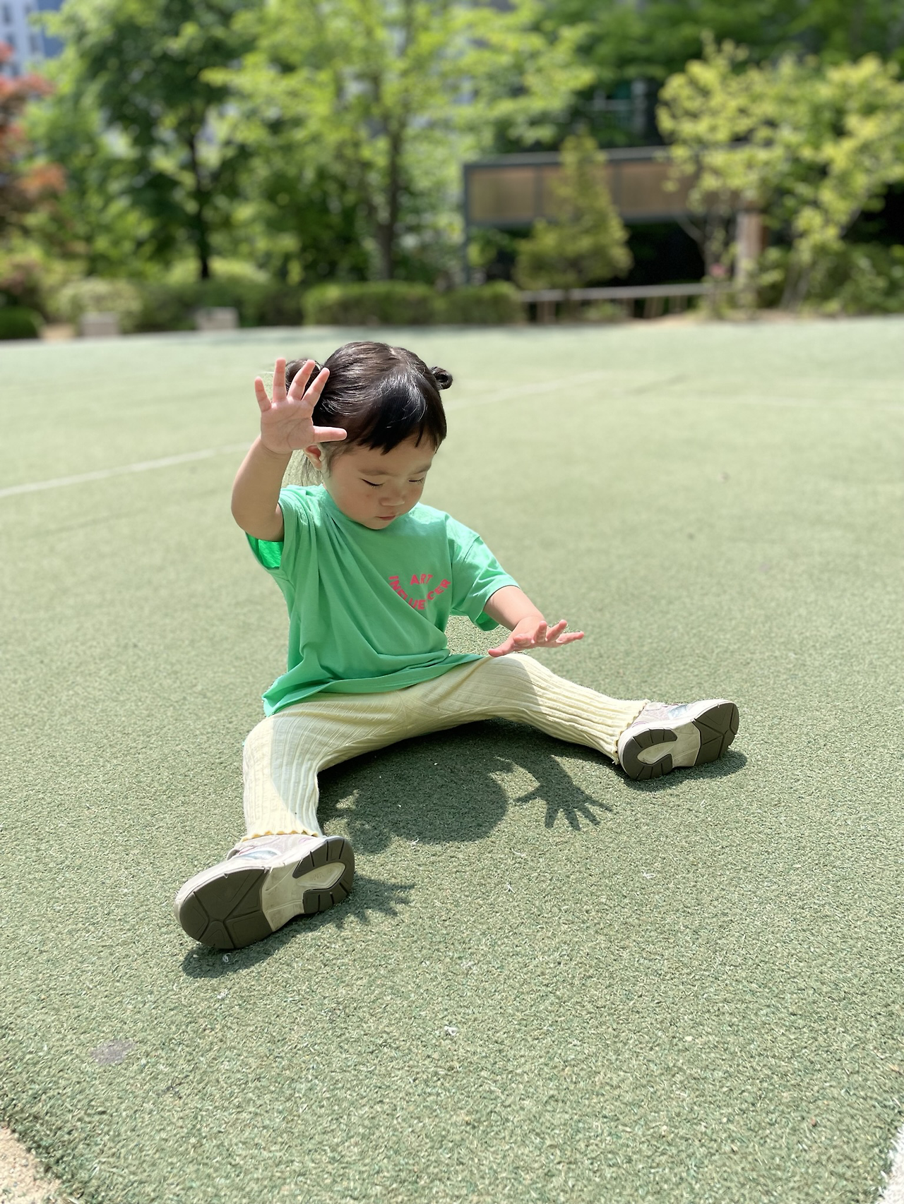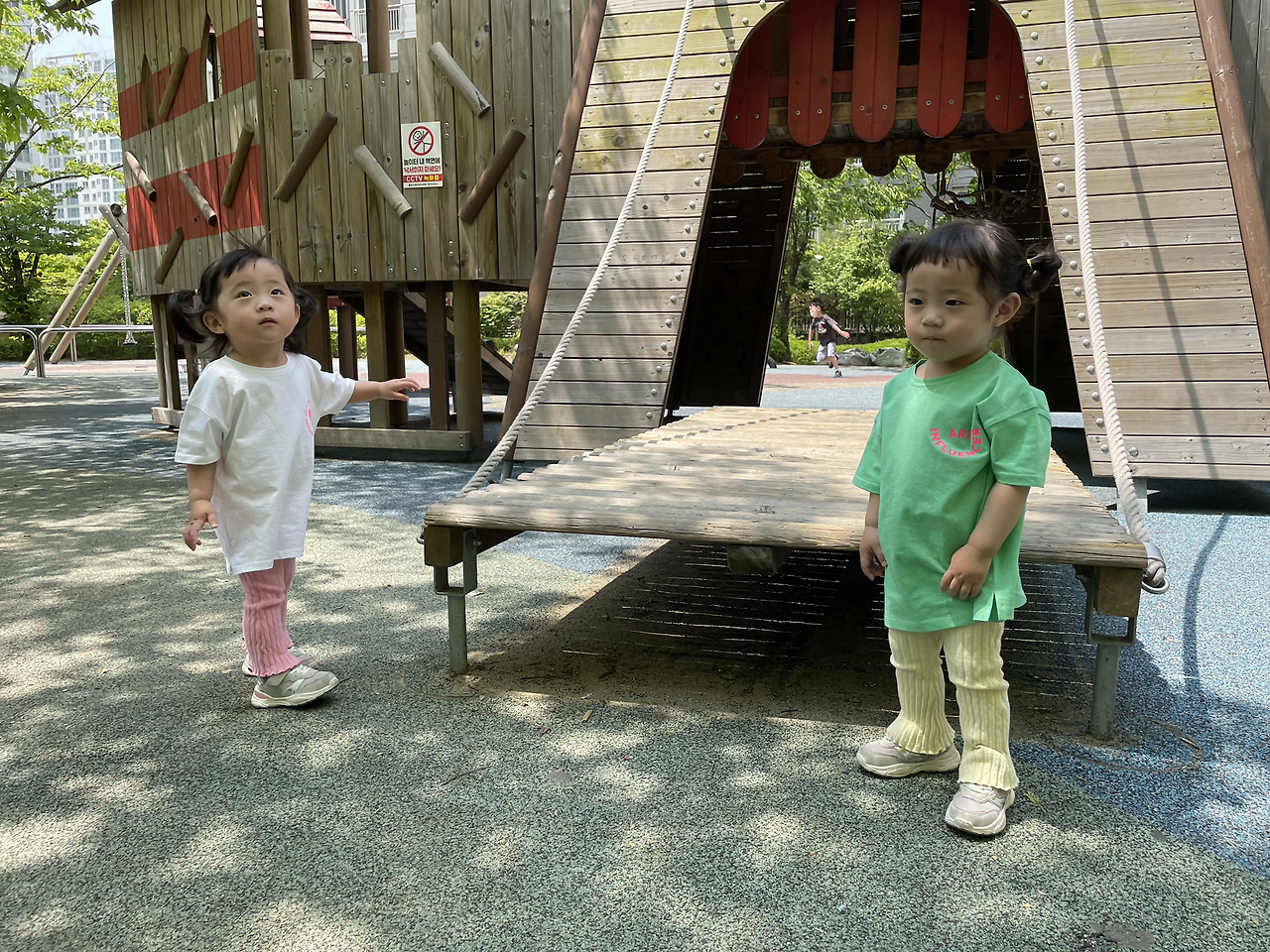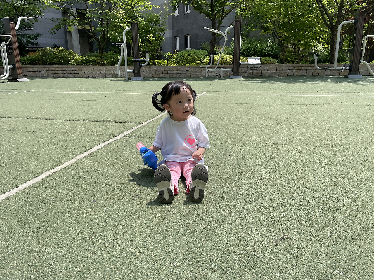 어쨌거나 병원 끝나고 놀이터에 갈 계획이었으니 순서가 바뀐 것으로 긍정적으로 생각하고 병원에서 가장 가까운 동네 놀이터로 향했다. 부랴부랴 나오느라 애들 간식을 제대로 안 가져 나와서 오아시스 마켓에 들러 사과주스 2, 샤인머스캣 주스 2, 새우짱 과자를 급히 샀다. 놀이터는 1/10 정도만 그늘이고 나머지는 다 땡볕이었다. 선크림을 바르긴 했으나 땡볕에서 아이 둘을 볼 자신이 없어 챙겨 나온 비눗방울 총을 너무 빨리 꺼냈다. 내가 비눗방울을 쏘면서 술래잡기 놀이도 하려고 했으나 호기심 많은 첫째에게 바로 뺏겨 버렸다. 첫째는 어제 터득한 방아쇠 버튼 고정을 요청했고, 나는 소리 지르기 전에 재빠르게 이에 응했다. 다행히 초등학교 하교 시간이라 놀이터에 아이들도 좀 있었고, 초딩 언니들이 가끔 다가와 비눗방울 놀이에 흥미를 가져 주었다. 그치만 1시간의 9/10 정도는 거의 내가 놀아 주어야 했다. 어제 4시간 반 잔 것과는 다르게 극강의 E성향인 쌍둥이 엄마는 텐션이 높아져 잘 놀아준 것 같다. 내 생각이다.