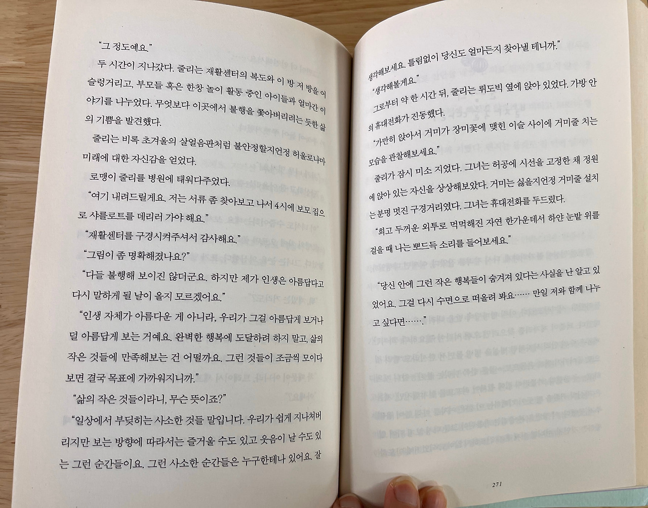 “인생 자체가 아름다운 게 아니라, 우리가 그걸 아름답게 보거나 덜 아름답게 보는 거예요. 완벽한 행복에 도달하려 하지 말고, 삶의 작은 것들에 만족해 보는 건 어떨까요. 그런 것들이 조금씩 모이다 보면 결국 목표에 가까워지니까.”
