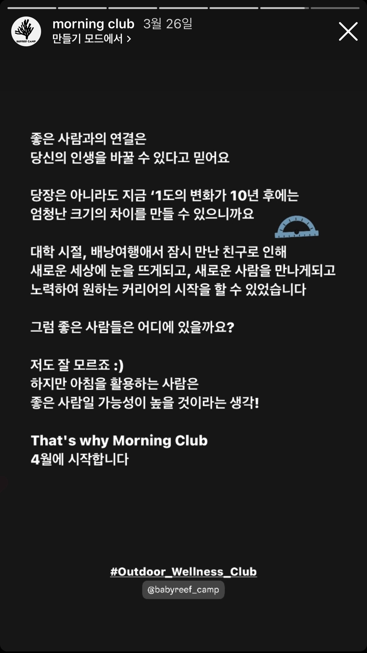 한 명 한 명의 건강(mentally & physically)한 사람들이 모여 연결되어 더 큰 가치를 만들어 낼 수 있다고 믿습니다. 건강하며 좋은 사람들이 어디에 있을지는 저도 모르지만, 하지만 아침을 잘 활용하는 사람 중에 있을 것이라고 생각합니다.
