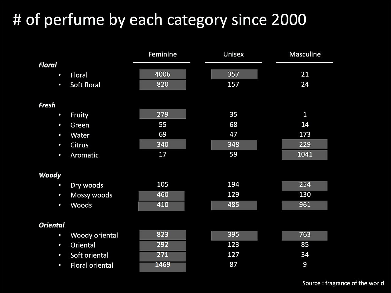그래서 받은 자료를 구조화해보니, 15년의 기간 동안 총 15,000여 개의 향수가 출시되었고, 역시나 feminine Target(60.1%)으로 가장 많이 출시되었습니다. 그중에서도 Floral(꽃향기) 중심의 향수가 압도적으로 많은 4,000여 개가 출시되었네요.. 참고로 Unisex 비중은 16%, 남성용은 23.9%입니다.