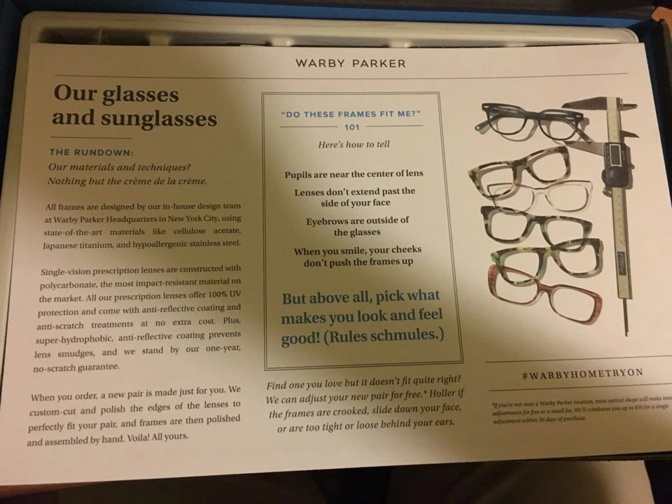 구매로 연결시키는 특별한 장치가 있겠지?라고 기대한 나에게 별게 없다는 것은 사실 충격이다. 맘에 들면, 사고 그렇지 않으면 다시 보내세욤.. 그 외에 없다. 일주일 내에 구매하면 20% 할인과 같은 즉각적인 CTA(call to action) 장치가 없다. 그런데 친구의 말이 파펨의 샘플은 제품을 체험하는 차원에서 그냥 무료 샘플 공짜로 한번 써보는 경험이지만, 와비파커의 경우 안경을 살 의사가 있는 사람이 이 샘플 box를 받는다면, 구매하게 될 확률은 높아질 것 같다는 의견을 알려주었다. 구매의사가 있는 고객이, 본인이 원하는 디자인의 안경 5가지를 선택하고, 그것을 샘플로 받고, 게다가 직접 착용까지 해보고.. 빠져나갈 구멍을 봉쇠한 느낌.