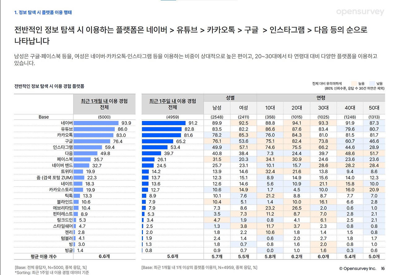 더 재미있는 점은 더 낮은 연령일수록 상황마다 다른 정보 탐색 플랫폼을 사용한다고 응답한 점이다(오픈서베이, 소셜미디어·검색 포털 트렌드 리포트 2022. 3월). Z세대가 보다 더 각 플랫폼의 특성을 깊게 체득했다고 할 수 있다.