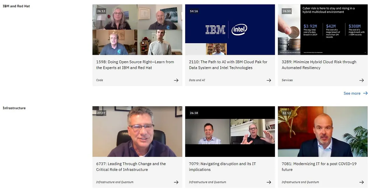 글로벌 IT기업의 대규모 컨퍼런스도 온라인으로 전환되었다. 매년 봄 신제품과 미래 비전을 발표하는 마이크로소프트(빌드 2020), 애플(세계 개발자 콘퍼런스 WWDC) 등은 온라인 컨퍼런스로 발표를 대체했다. 나는 그중 IBM에서 진행되는 IBM Global Conference Think 2020에 참석했다. 원래는 한국에서 쉽게 들을 수 없는 콘텐츠들을 무료로 접할 수 있었다. 약 10만 명이 행사에 등록했다고 한다. 컨퍼런스 현장에서는 동시에 여러 개의 강연이 진행되어 놓치는 경우도 많은데, 온라인으로는 클릭 한 번으로 여러 개의 강연을 비교하며 볼 수 있었다. 선택의 자유도가 매우 높다. 모든 영상은 녹화되고 있기 때문에 후에 일부 강연은 녹화본으로도 제공된다. 단점이라면, 나중에 봐야지 하고 지나쳤다가 아직 열어보지 못한 것들이 쌓인다는 점이다.
