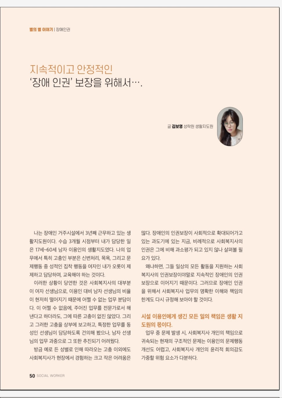 왜냐하면, 그들 일상의 모든 활동을 지원하는 사회복지사의 인권보장이야말로 지속적인 장애인의 인권보장으로 이어지기 때문이다.