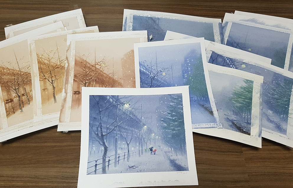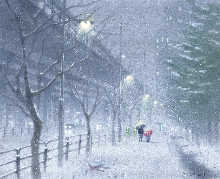 분노와 무기력 사이를 수없이 오가는 동안 처음 이 그림을 구상했을 때의 순수한 감흥은 거의 다 사라져 버렸다. 이 그림을 꼭 그려야 할 이유도 언젠가부터는 생각해 낼 수 없었다. 몇 번이고 중도 포기의 유혹에 흔들렸는데, 이상하게도 지난겨울, 하얀 거리 위로 금빛 가루를 흩뿌리며 서 있던 가로등과 그 아래로 서서히 시야에서 멀어져 가던 한 모녀의 뒷모습이 잊히지가 않았다. 그 풍경을 종이에 담고 싶은 욕심이 끝내 포기되지가 않았다. 마지막 그림은 거의 '내가 이기나 네가 이기나 어디 한번 해보자'라는 식의 오기와 집착의 힘만으로 그린 것 같다.