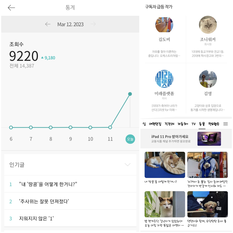 자기 글에 대한 조회수를 보더라고. 매일 한 번은 하는 일이야. 그런데, 눈이 휘둥그레졌어. 무려 하루 조회수가 9천 명이 넘어가더라고 잘하면 만명도 되겠더라. 하루종일 그는 들떠 있었어. 나도 약간은 신기했어. 데이터를 분석한 것을 보았는데 죄다 외부에서 유입된 인원이었어. 어떤 알고리즘으로 그리 된 거지 이해가 안 되더라. 한 때 구독자 급등작가에 올랐을 때도 그다지 기뻐하지 않더니 그날은 많이 흥분되었더라고. 답답한 골목길에서 헤매다 넓은 도로로 나온 듯한 시원한 표정도 있더라고. 이리저리 원인을 찾더니 혹시나 하고 네이버나 다음을 검색하더라고. 그런데, 두둥, 다음의 메인화면에 떠있었어. '내 땅콩을 어떻게 한거니?'가 올라있더라고. 내 땅콩 팔아 조회수 올린 거에 흥분된 거야. 심봉사가 지 딸 팔아 눈뜬 거랑 별반 다르지 않더라. 그의 얼굴은 마치 진짜 소설가가 다된 모양이었어. 그러면서 안타까워하더라. 왜 사람들은 작심하고 쓴 글은 읽어주지 않는다고.