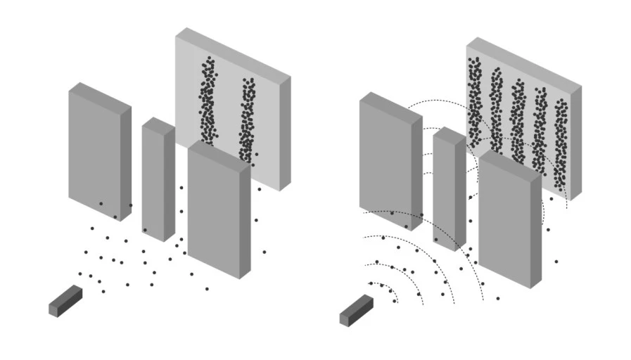 무슨 말이냐면 이런 이야기이다. 전자를 이중슬릿을 향해 쏘았을 때 전자가 입자라면 [그림 1]처럼 벽면에 두 줄이 나와야 하지만 실제로는 [그림 2]와 같이 여러 개의 줄이 나온 것으로 보아 전자는 물결 같은 파동임이 밝혀졌다. 더 놀라운 것은 이런 일이 생긴 원인을 찾기 위해 관측을 시도하면 다시 두 줄이 나오면서 입자의 성질을 띤다. 보지 않으면 파동이고, 보게 되면 입자가 된다. 상식적으로 이해가 안 될 거다. 당신이 배팅 연습장에 있다고 가정해 보자. 피칭머신과 당신 사이에는 두 개의 틈새가 있는데 피칭머신을 보고 있으면 공이 두 개의 틈새 중 한 곳으로 공이 나오지만 피칭머신을 보지 않으면 두 개의 틈새로 공이 동시에 나온다는 이야기이다.
