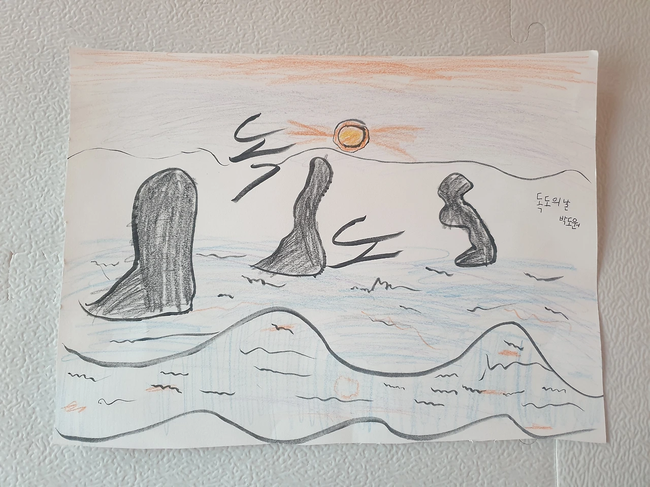 아들과 함께 노을 지는 독도의 바다를 표현해 봤습니다.^^