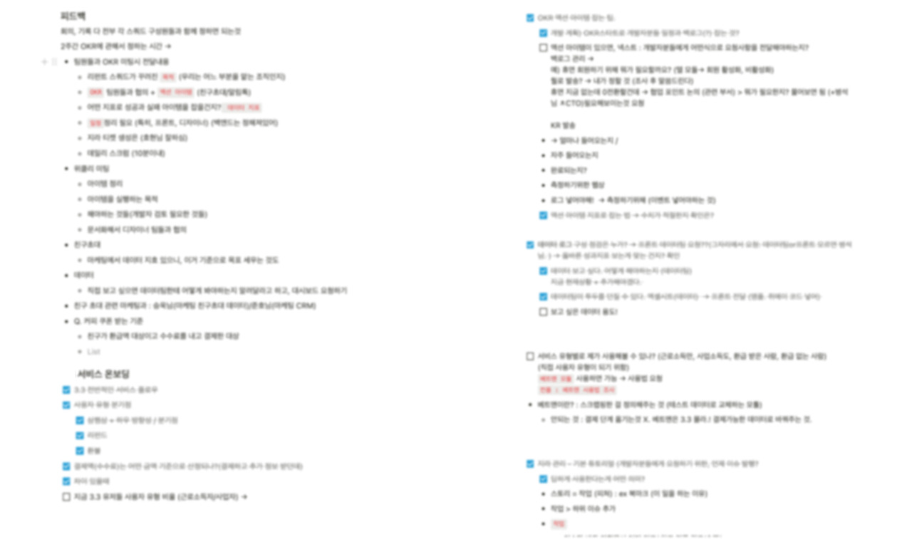 확실한 건 온보딩 티타임 후, 프로덕트 전체 구조, 앞으로 회사 사업 방향성에 이해도를 높일 수 있었다. 프로덕트의 성장과정 N년 여정을 요약본으로 들은 느낌이었다. 이때 공유받은 내용들로 인해 다음 회의 내용 파악도 쉽고 다음 OKR선정에 있어서 확실한 도움이 되었다.