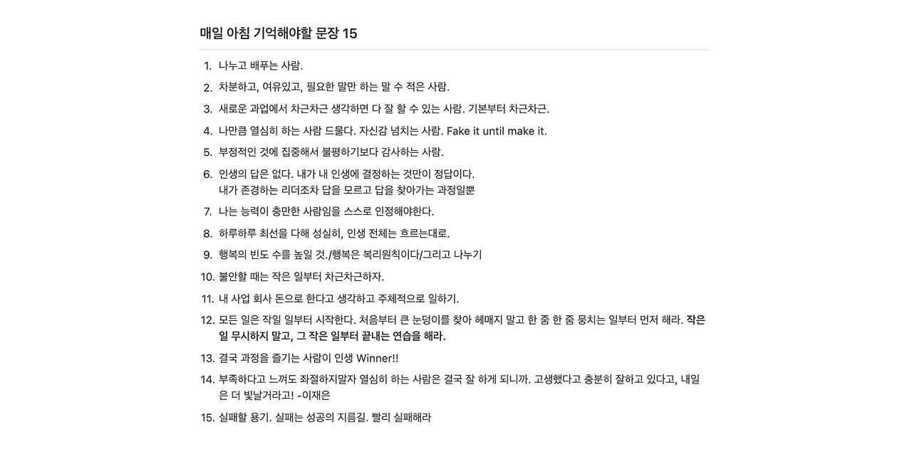 지배했으면 하는 생각들을 15개 나열했고, 매일 아침 양치질할 때마다 읽는다. 이러한 생각들이 모여 어떤 상황에서 잘 휘둘리지 않고, 나만의 철학을 가진 단단한 사람이 될 수 있다고 믿는다.