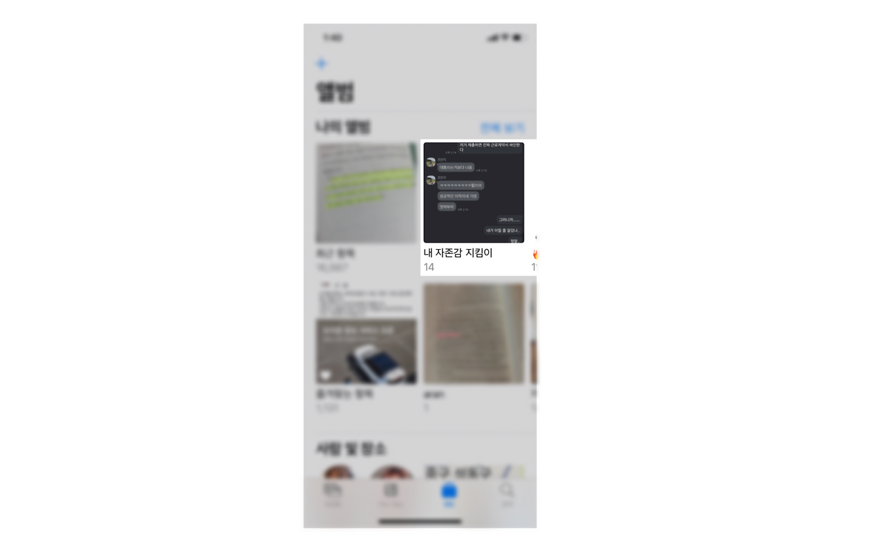 앨범에 자존감 지킴이 폴더가 있다. 인복이 많아서 그런지 지인들과 이야기하다 보면, 힘이 되는 말을 참 많이 듣는다. 그럴 때마다 스크린샷을 하여 자존감 지킴이 폴더에 옮겨둔다. 조금이라도 자존감이 떨어지고 낙담하는 일이 생길 때 그 당시 이야기 나눈 응원의 말들을 보면, 다시 잘할 수 있겠다고 긍정적으로 생각 회로를 전환하는 데 도움이 된다.
