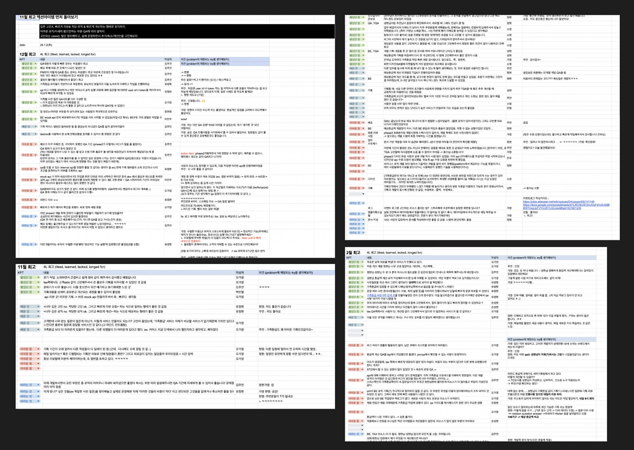 우리 팀은 주기적으로 최소 1달에 1번 회고 시간을 가집니다. 입사 초기에는 서비스 출시 후 회고했지만 주기가 길어지면서 현재는 3주-4주에 한 번씩 합니다. 회고할 내용이 많지 않더라도, 주기적인 회고 시간은 팀원들에게 발언할 기회와 업무 프로세스 개선할 수 있는 기회를 제공합니다.