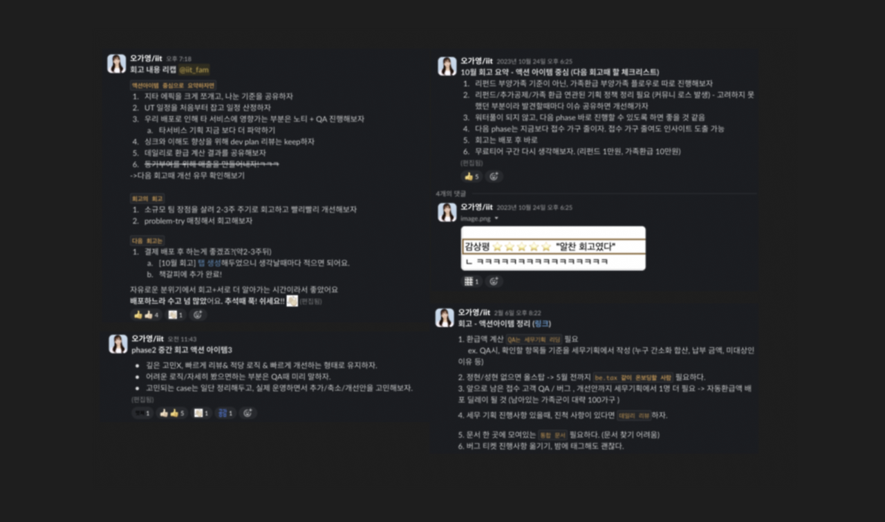3) 회고에서 나온 액션아이템을 정리해서 즉각 공유합니다. 다음 회고 때까지 개선하려고 의식적으로 노력합니다.