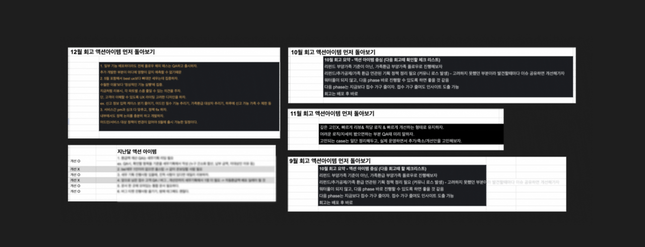 회고가 끝나면 항상 액션 아이템을 정리하고, 다음 회고 시작 때 얼마나 개선되었는지 살펴보는 프로세스를 만들었습니다. 이런 반복적인 피드백 과정은 업무의 만족도 및 생산성을 향상하는데 도움이 됩니다.