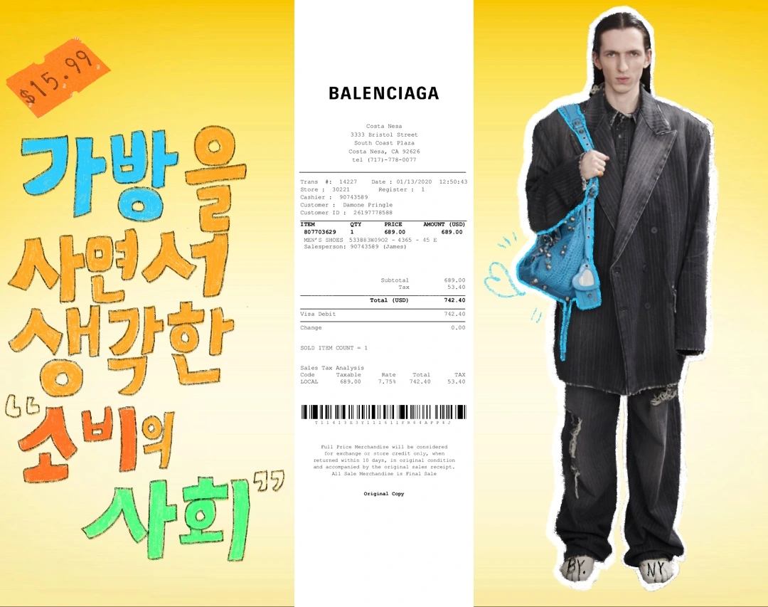 그럼에도 패션을 지켜보고 그 안에서 자유를 찾는 것은 내게 즐거운 일이다. 적당한 선에서 중고 거래 플랫폼 속 맘에 쏙 드는 옷을 찾을 때의 희열감은 엄청 나다. 몇 년이고 그 옷을 볼 때마다 모종의 뿌듯함이 마음 한켠에서 빛나니까. 그 뿐만이 아니다. 패션은 단지 패션이 아니다. 패션은 사진, 음악, 미술, 소설, 시, 영화 등 여러 영역의 미적 현상들의 총체이며 깊게 들여다보면 현재 자본주의 문화와 삶이 갇혀 있는 신화성을 드러내고 해체하는 순간들을 운 좋게 마주할 때도 있다. 이런 순간들이 결국 내가 패션을 좋아하게 만드는 이유이다. 특히 디자이너 뎀나의 발렌시아가가 그런 흥미로운 지점을 보일 때가 많다. 공교롭게도 나의 첫 하이브랜드 가방은 위에서 말한 발렌시아가의 르카골이었고 그들이 브랜드를 보여주는 방식에 흥미를 느낀다. 무엇보다 정치와 패션이 만날 때가 더욱 그렇다.