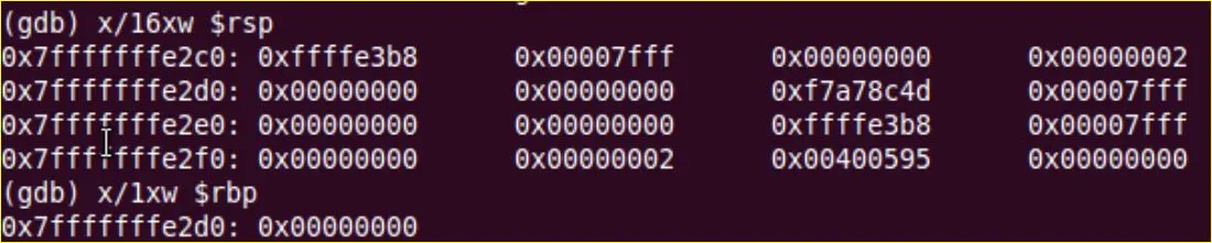 이번에는 명령어 'x/1xw $rbp' 명령어로 다음과 같은 메모리 내용을 확인해보자.