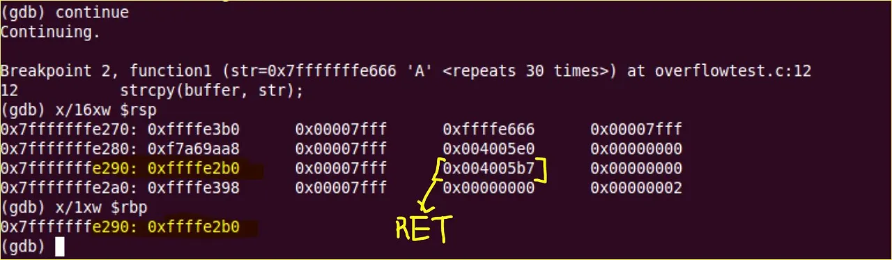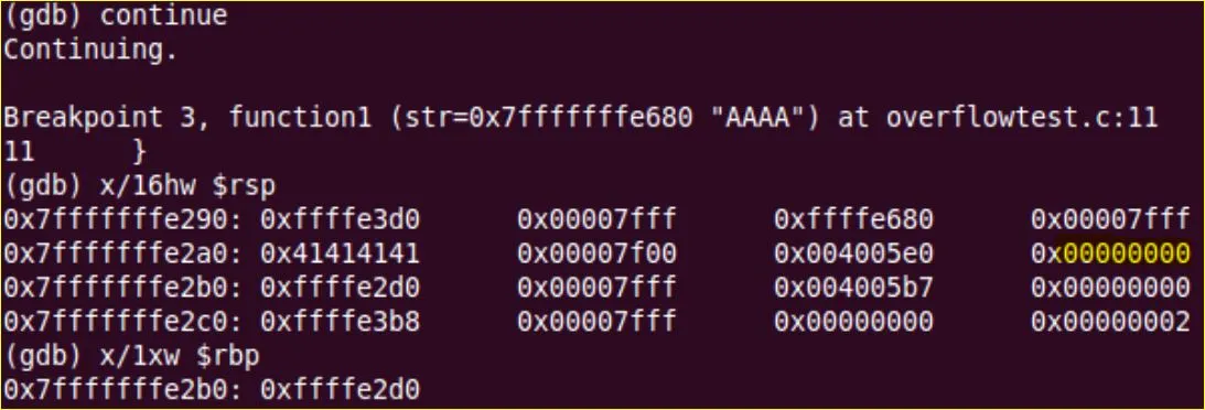 한번 더 continue 명령을 입력해서 다음 중단점(10행)인 function() 함수가 호출되어 함수 내부의 strcpy 함수가 실행되기 직전까지의 메모리 데이터를 출력한다. 그래서 다시 'x/16xw $rsp' 명령과 'x/1xw $rbp' 명령으로 %ESP와 %EBP의 레지스터를 출력해서 다음 function() 함수 부분의 메모리 데이터를 확인해본다.