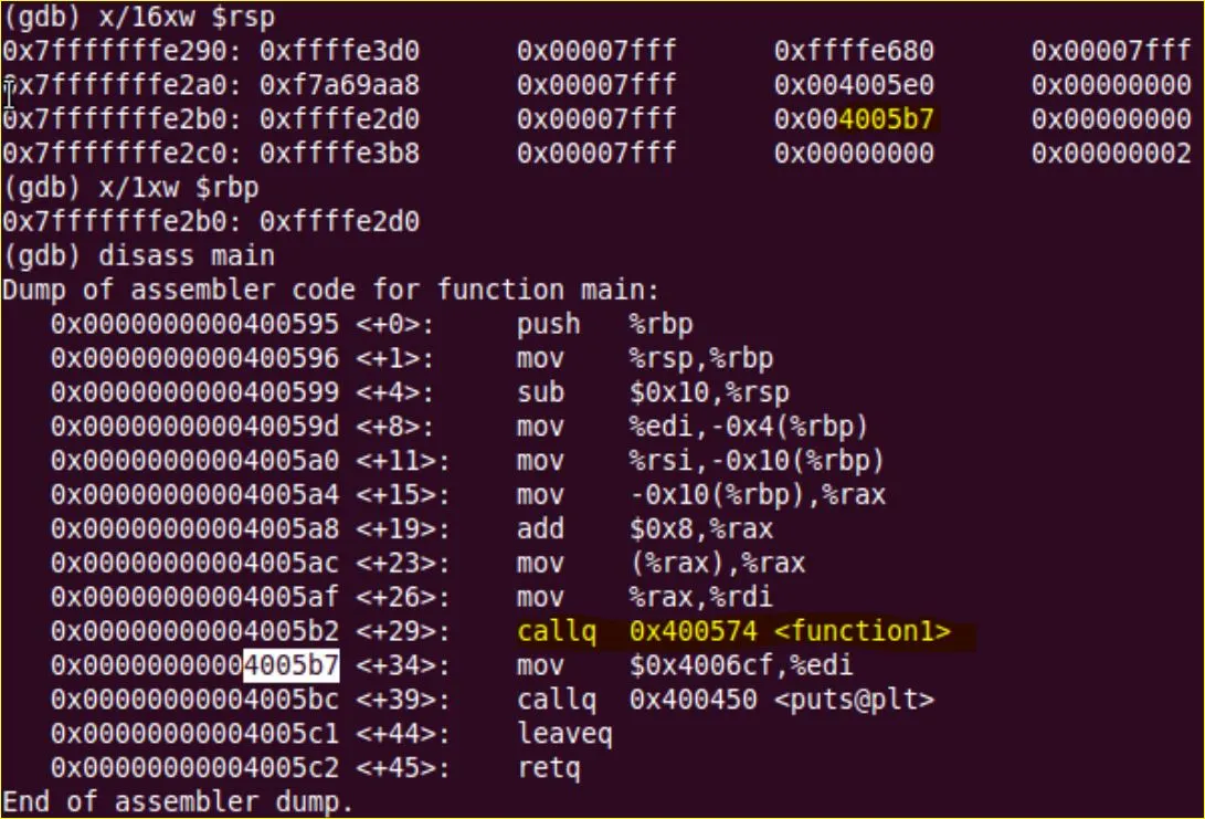 function() 함수의 %ESP 레지스터 구간은 위의 출력 화면과 같으며 그 위의 화면에서 'disass(embly) main' 명령을 통해 main() 함수의 어셈블리 과정을 확인할 수 있다. 여기서 알아야 할 포인트가 function() 함수(화면에서 <function1> )를 호출하는 지점에서 다음 main() 함수로 jump 해야 할 주소(RETurn addr.)가 '0x00...04005b7'이라는 것이다.