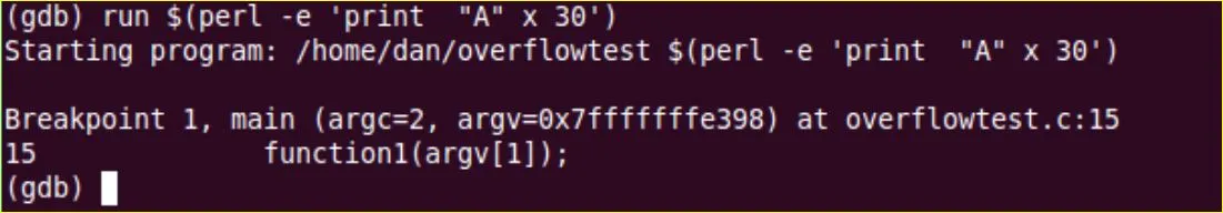 run $(perl -e 'print "A" x 30')이라는 명령은 펄(perl)이라는 스크립트 언어를 이용해서 실행하는 구문으로 A라는 문자를 30번 출력해라는 명령이다. 이후에 continue 명령을 계속 입력하면서 명령어 실행 후 중간에 끊기지 않고 계속 실행할 수 있게 하기 위해 펄을 이용한다.