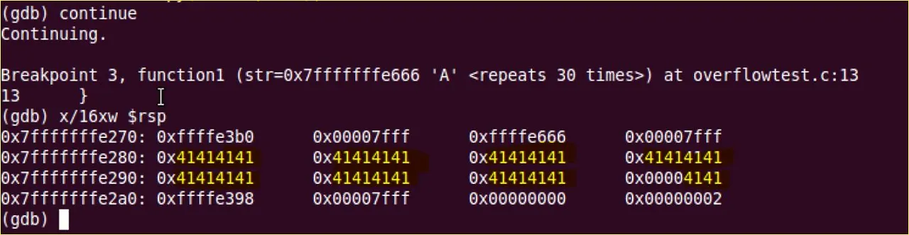 이제 흥미로운 부분이 나온다. 한번 더 continue 명령을 입력하면 이전과 달리 ‘41’로 시작하는 메모리 데이터 부분이 훨씬 더 많이 발생한 것을 확인할 수 있다. 정확히 '41'이 30개 더 메모리 데이터들을 덮어썼다는 것을 알 수 있다. 이제 공격을 위한 소스 코드의 주소를 몇 번째 이후에 입력해야 할지 정확히 계산해야 할 시점이다.