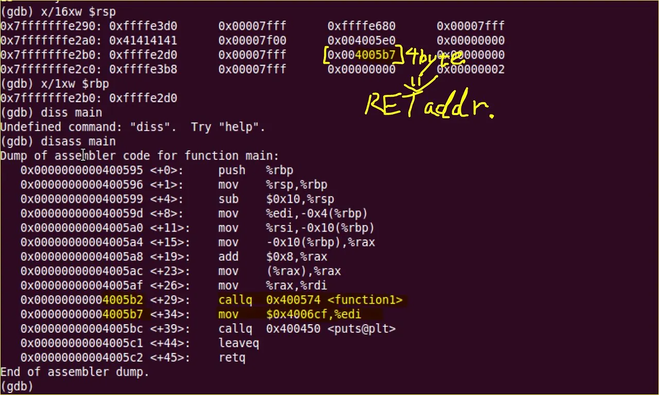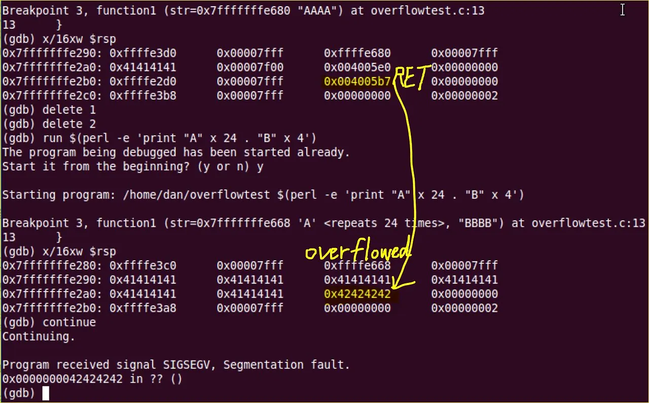 위의 화면에서 'x/16xw $rsp' 명령을 통해 두 번째 중단점(function() 함수 내부의 strcpy가 실행되기 직전)까지의 %RSP(ESP) 내용을 확인하였고, 'x/1xw $rbp' 명령을 통해 %RBP(EBP)가 어디서 시작되는지 확인했다. 그리고 %RSP 레지스터 레이블에 해당하는 '0x7fffffffe2a0'의 데이터 내용 첫 번째에 '0x41414141'이 기록되어 있는 것으로 보아 여기에 'AAAA'문자열이 기록되었다는 것도 알 수 있다.