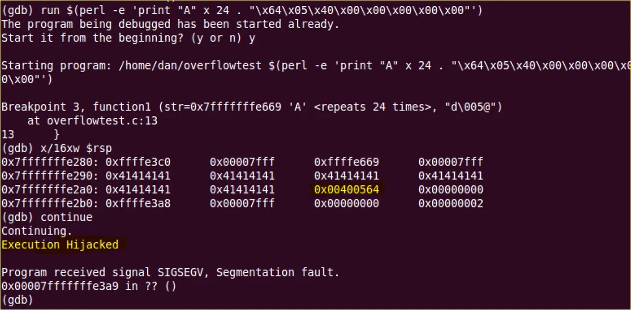 리틀 엔디안 방식으로 디버깅 명령을 입력하면, run $(perl -e 'print "A" x 24 . "\x64\x05\x40\~\x00"')이다. continue 명령으로 마지막 종단점 이후 프로그램 디버깅 실행을 마치자, 호출되었던 overflowed() 함수 내부의 출력문 결과가 떴다. 이제 실행을 가로챘다. 즉 %EIP 레지스터의 제어권을 조종할 수 있게 되었고 실제 해커들은 여기에 악성코드 주소로 덮어써서 이후 목표(관리자 권한 획득)로 하는 공격을 전개할 수 있다.