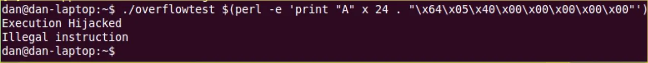 디버거 외의 리눅스 커맨드 라인 단에서 결과를 보려면 다음과 같이 조작한 RETurn 주소('0x00400564')를 포함하는 문자열을 인자로 하여 overflowtest를 실행하면 된다.
