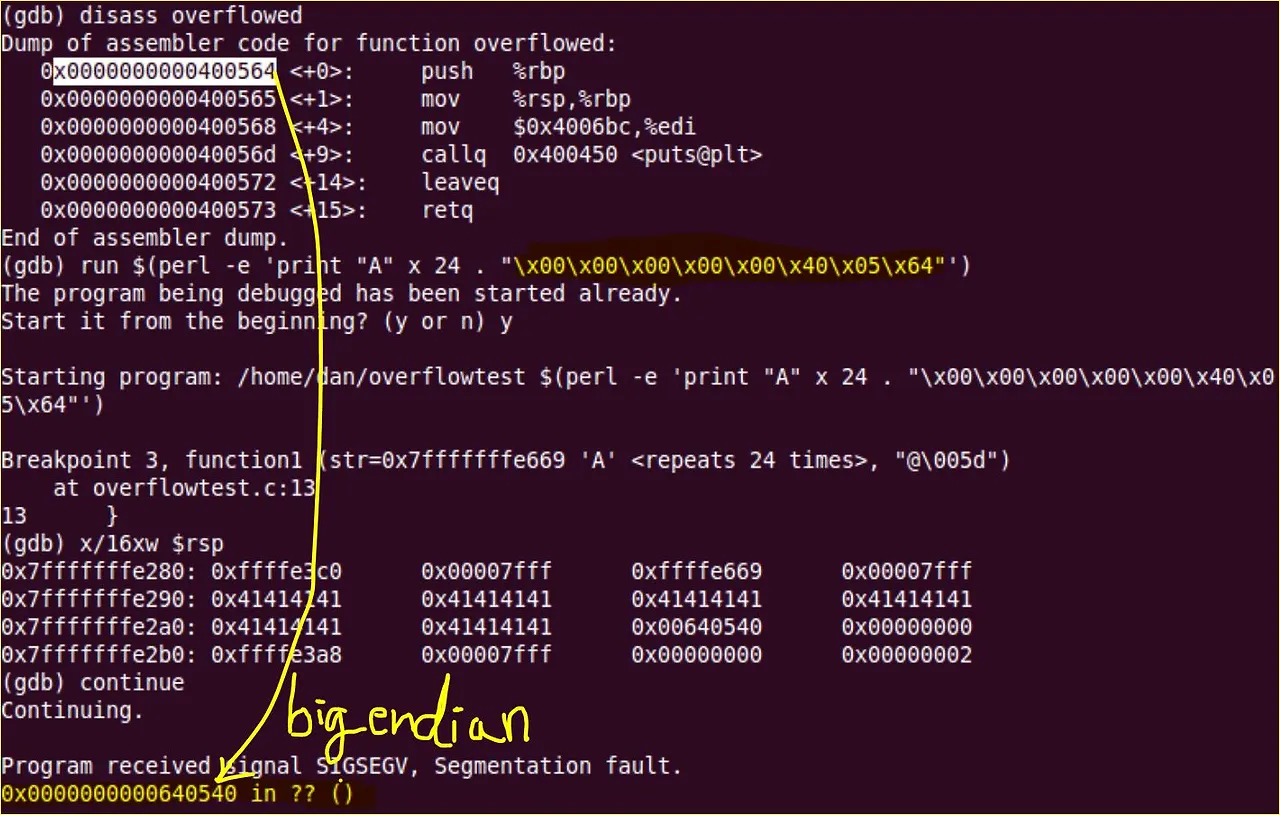 그러면 overflowed() 함수가 제대로 호출되지 않았다는 것을 짐작할 수 있고 위의 화면에서 'x/16xw $rsp' 명령으로 확인한 복귀 주소에는 '0x00400564'가 아닌, '0x00640540'가 덮어져 있음을 볼 수 있다. 이 두 16진수 문자를 자세히 뜯어보니, 단지 데이터의 각 두 자리의 숫자가 뒤바뀌어 있다는 것을 볼 수 있다. 이것을 리틀 엔디안(LSB)* 방식이라고 부르는데, 인텔 아키텍처(IA)-32를 따르는 운영체제인 경우는 이 방식대로 16진수 표기를 해야 컴파일할 때 우리가 생각하는 순서대로 컴퓨터가 알아먹는다. 쉽게 말해 순서대로 입력한 방식은 '빅 엔디안'을 따르는 운영체제에서 먹히고 지금은 IA-32 아키텍처를 따르는 리눅스 우분투이기 때문에 '리틀 엔디안' 방식대로 입력해야 한다.