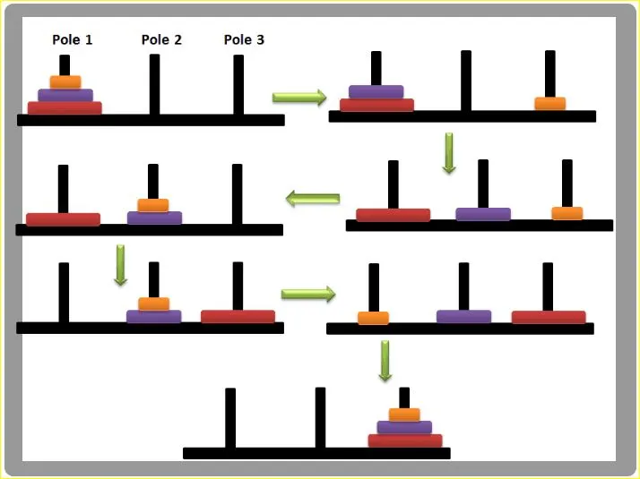 재귀 호출을 이용한 하노이탑 알고리즘 함수의 작성은 간단하나, 직접 순서를 짜는 것은 일련의 과정을 머릿속에서 그릴 수 없다면 시도조차 하기 어려울 것이다. 그래서 머릿속에서 먼저 처음 그림의 과정을 하나씩 그려보고 수식으로 표현할 줄 아는 단계를 거쳐야 원반 세 개를 옮기는 것의 일반적인 경우(원반이 n개일 때)도 생각할 수 있다.