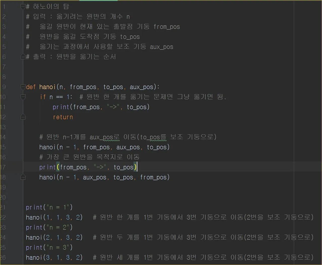 원반이 한 개일 때가 '종료 조건'에 해당한다. 원반 n개 문제를 풀려면 n-1개 원반 문제를 풀어야 하는데, 이는 바로 '좀 더 작은 값으로 자기 자신을 호출하는 과정'이다. 따라서 이 문제는 전형적인 재귀 호출 알고리즘에 해당한다(이승찬, 2017).