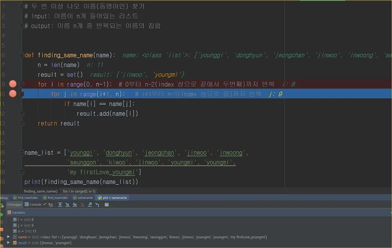 동명이인을 찾는 알고리즘은 난이도의 순서 상 재귀보다 앞서 있지만 이전에 쉽게 풀어서 지금 다시 리뷰를 하는데, 의외로 헛갈렸다. 왜냐하면 리스트 값을 검색하는 인덱스(index, 색인)를 중첩 반복문 내부에서 지정하는 것이 처음에 스스로 쥐어짜 내었던 게 아니었기 때문이다. 이 알고리즘에서 주의할 점은 다음과 같다.