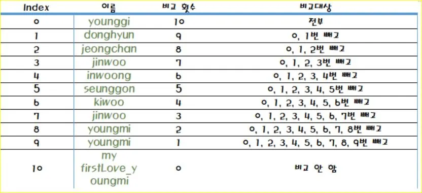 0번 위치 이름: n-1번 비교(자기를 제외한 모든 이름과 비교)
