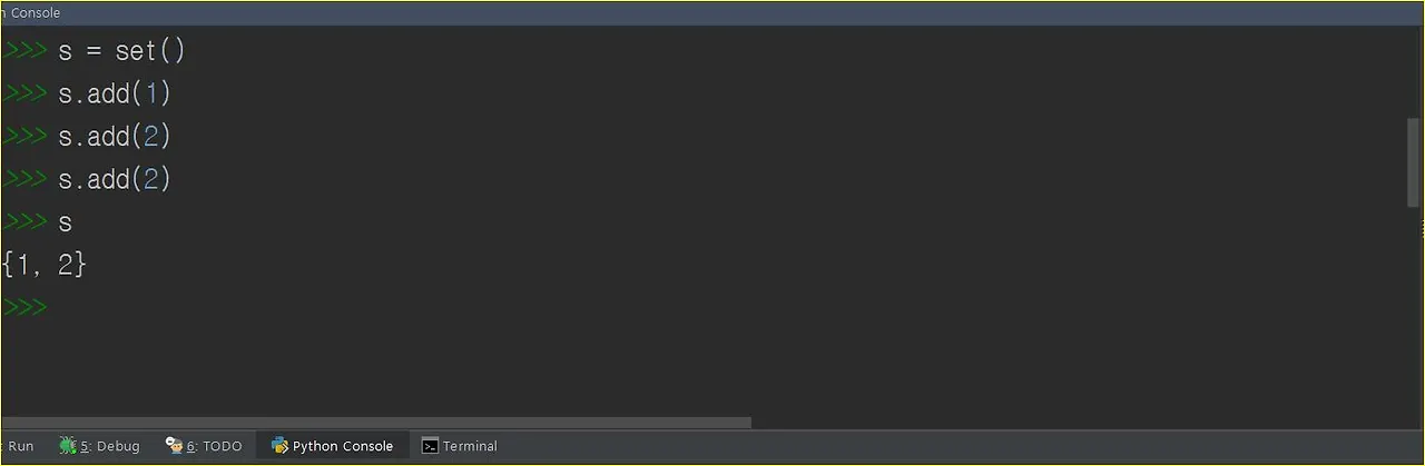 빈 집합을 만들려면 set()을 이용하고, 집합에 자료를 추가하려면 add() 함수를 이용한다. 또한, 리스트와 마찬가지로 집합 안에 자료가 몇 개 있는지 알려면 len() 함수를 이용한다(이승찬, 2017).