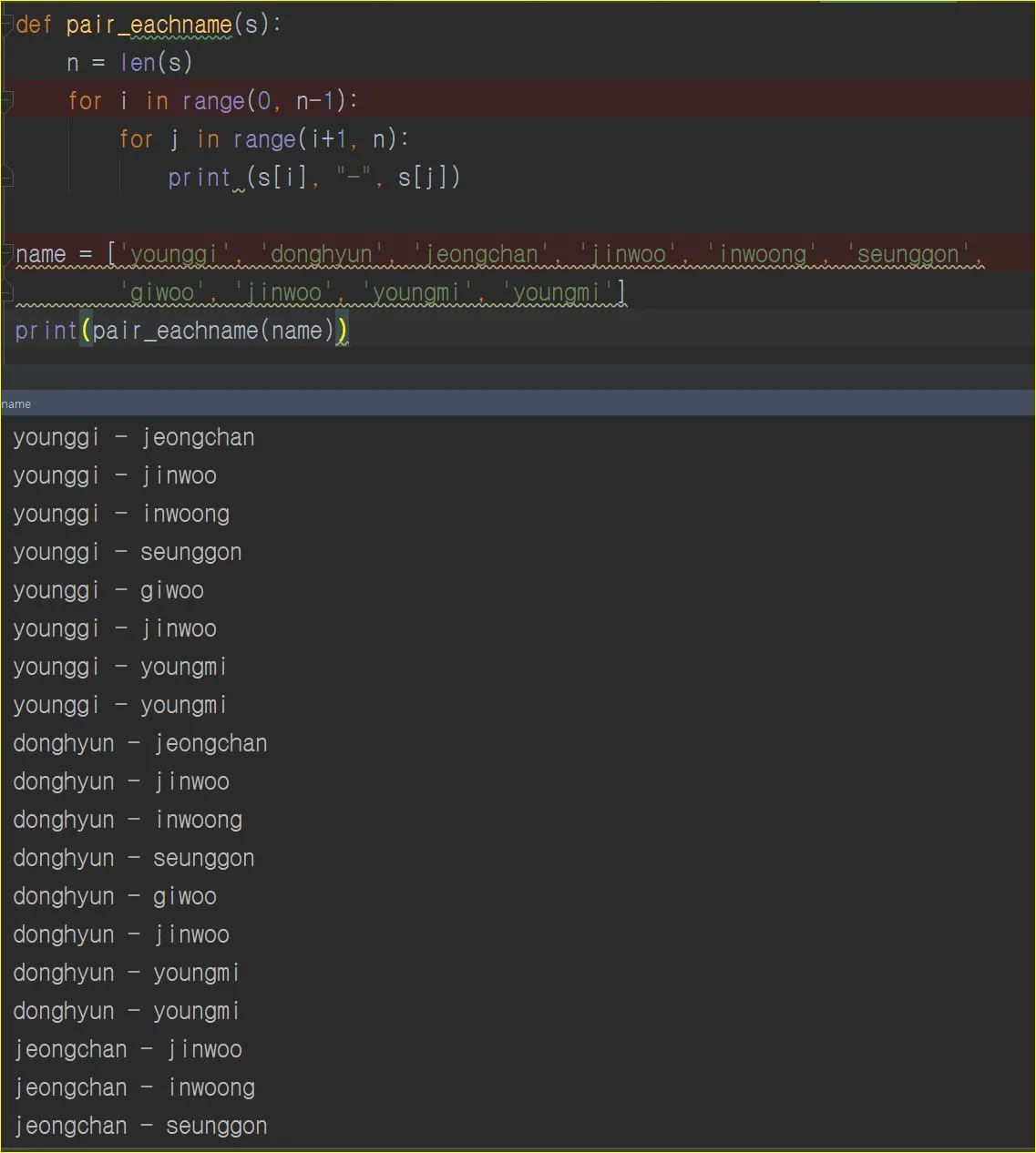 결국 전체 비교 횟수는 0 + 1 + 2 + 3 + 4 + ... + (n-1) 번, 즉 1부터 n-1까지의 합이다. 위의 프로그램에서는 1부터 10까지의 합(11 x 5)인 55번이 된다. 55번의 중복 없이 리스트의 이름을 비교하기 위해서 실제 중첩 반복문의 실행 순서를 보면, 변수 j의 반복문 돌림 횟수 11번 곱하기 변수 i의 반복문 돌림 횟수 11번으로 총 121번의 되풀이(Iteration) 된다.