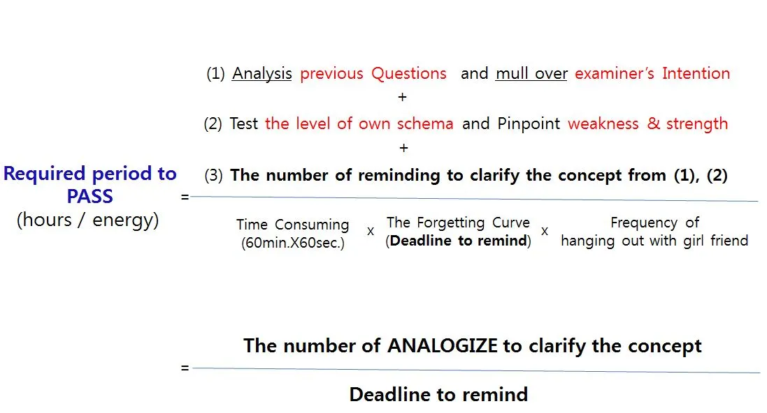 수학공식도, 그리고 어떠한 일반 개념을 묻는 이론도 암기하기 위해서는 그러한 개념을 도출할 수 있는 이해력이 선행되어야 한다. 이해하지 못하는 암기("이해를 완벽히 하면, 암기는 되어있다.")는 무한반복에 의해서만 서술적 지식(‘머릿속에서 부유하고 있는 지식’)에서 절차적 지식(‘10년 만에 자전거를 타도 탈 수 있는 몸의 기억력’)으로 넘어가 체화가 되지 않는 이상, 다시 그 내용을 펜으로 긁적이거나 입으로 내뱉어지지 않는다. 그런데 출제 범위가 광범위하고 기출문제를 여러 번 보고도, 당사자의 머릿속에서 입출력의 지연시간(latency)이 그의 인내력을 벗어나는 유형이 많다면 암기로 승부가 가능할까?