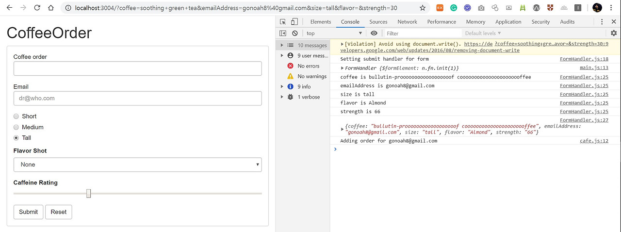 다음 섹션부터 데이터를 DOM에 추가하여 FormHandler라는 모듈의 역할을 보완할 수 있는 스크립트 코드 작성과 사용자 인터페이스(User Interface) 상의 입력 폼(이것을 Form이라고 한다)에 커피 주문을 입력하는데 누군가 누락된 정보 또는 사용할 수 없는 정보로 주문하려고 할 때 애플리케이션에서 어떤 일이 발생하는지에 대한 폼 검증을 시도하고, 약간의 코드(Secure coding)로 이러한 유효성 검증을 하는 것도 진행하려 한다. 대부분의 최신 브라우저는 폼 데이터를 제출할 때 유효성 검사를 할 준비가 되어 있고, 해야 할 일은 규칙을 제공하는 것이 전부이다(아키노, 2017). 그럼에도 불구하고 가장 많은 보안 사고가 이와 관련된 XSS(Cross-Site Scripting, CSS(Cascade Style Sheet)와 구분하기 위해 본래의 철자 C를 X로 바꾸어 부른다)와 CSRF(Cross-Site Request Forgery, 크로스 사이트 요청 위조) 공격으로 이루어진다.
