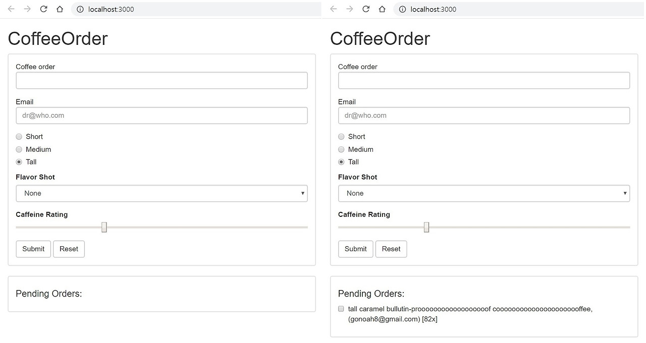 그리고 새롭게 추가할 UI(User Interface) 코드의 다른 부분인 CheckList 모듈은 Cafe 모듈과 마찬가지로 FormHandler로부터 데이터를 받지만, 대기 주문 체크리스트를 페이지에 추가하는 동작을 한다. 체크리스트의 항목을 클릭했을 때 체크리스트는 페이지에서 해당 항목을 지우고 Cafe 모듈에도 DataStore에서 제거하도록 알린다.