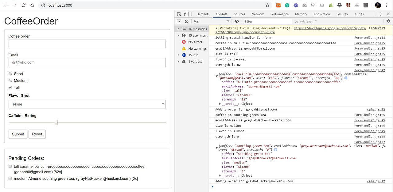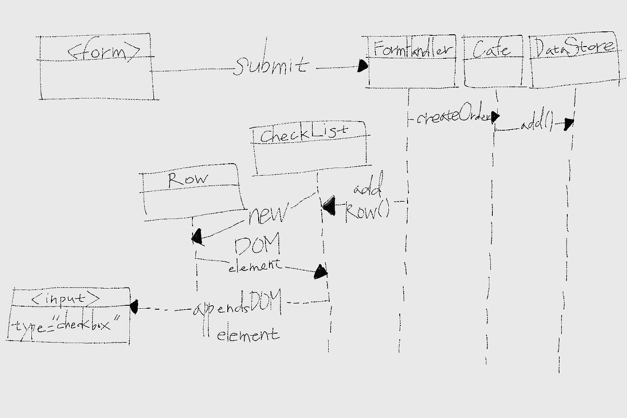 위의 이벤트 순서 도식에서 가운데 CheckList 박스(모듈)라는 아직까지 코드로 짜지 않은 로직이 하나 보일 것이다. 이번 섹션은 데이터를 DOM(Document Object Model, 브라우저 화면에서 보이는 주문 폼 <form>과 관련된 모듈)으로 보내는 코드를 추가한다. 그러면 위의 이벤트가 어떻게 진행하는지 한 번 따라가 보자. 먼저 앞서 만든 FormHandler라는 모듈이라는 비즈니스 로직(애플리케이션을 컨트롤하기 위한 구성요소라는 개념으로 커피를 주문받은 뒤에 바리스타에게 주문 내역을 확인시켜주고 완료(제거)하는 업무를 제어해주는 파트)에 사용자가 주문한 데이터를 제출(submit)한다. 이 모듈은 사용자가 상호작용(Interactive, 반응을 보이는)하는 폼과 나머지 코드를 연결하는 역할을 한다. submit 이벤트를 가로채 사용자의 입력을 createOrder()라는 함수(메서드)를 통해 Cafe 모듈(인스턴스)에 제공하여 마찬가지로 DataStore 인스턴스에 add() 메서드를 통해 저장하게 한다.