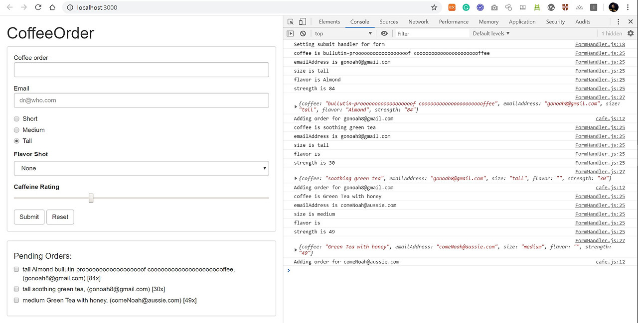섹션 #10에서 만들었던 CoffeeOrder App의 실습과정을 정리하면, CoffeeOrder의 사용자는 폼을 채워(입력) 주문을 추가할 수 있다. 폼을 제출하면 애플리케이션의 데이터베이스에 주문 정보를 추가하고 아래와 같이 주문을 체크리스트(Pending Orders) 항목으로 보여준다(아키노, 2017).
