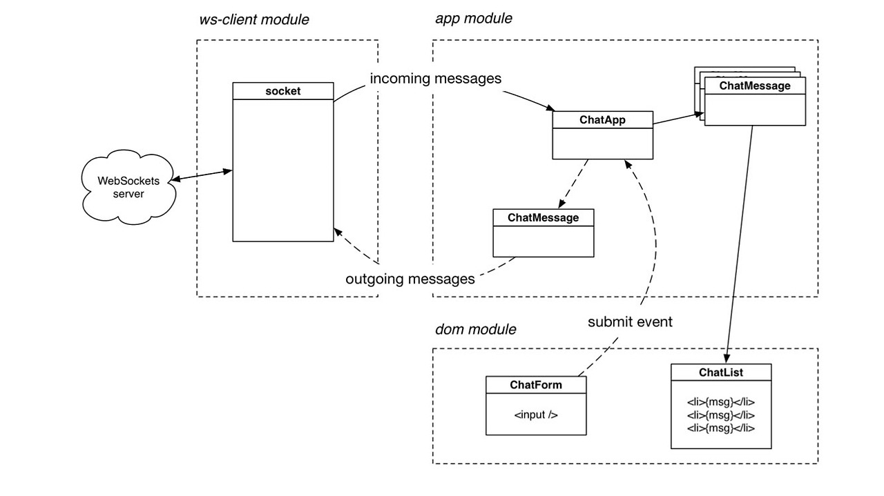 즉 이미 갖은 사례로 정형화된 소스를 보지 않고도 자신이 같은 순서의 알고리즘에 맞게 코딩할 수 있어야 코더가 아닌, 개발자라고 할 수 있다. 그리고 채팅 프로그램은 아래와 같은 모듈 간의 로직의 순서로 이루어진다. 필자는 보안 아키텍트가 본인의 커리어에서 지향하는 끝점이기 때문에 사실은 소스 구현보다는 아래와 같은 로직 설계를 도메인(분야) 별로 볼 수 있는 안목이 더 필요할지도 모르겠다. 어차피 지금부터 아무리 애써도 나보다 개발은 더욱 잘하는 인력이 넘치는 게(세계 시장으로) 현실이기에, 그들보다 차별화를 기할 수 있는 것을 개발하는 것이 급선무이다. 다음 섹션부터는 DDD(Domain Driven-Development)가 무엇인지 해당 개념에 대해서 짚어보려고 한다.